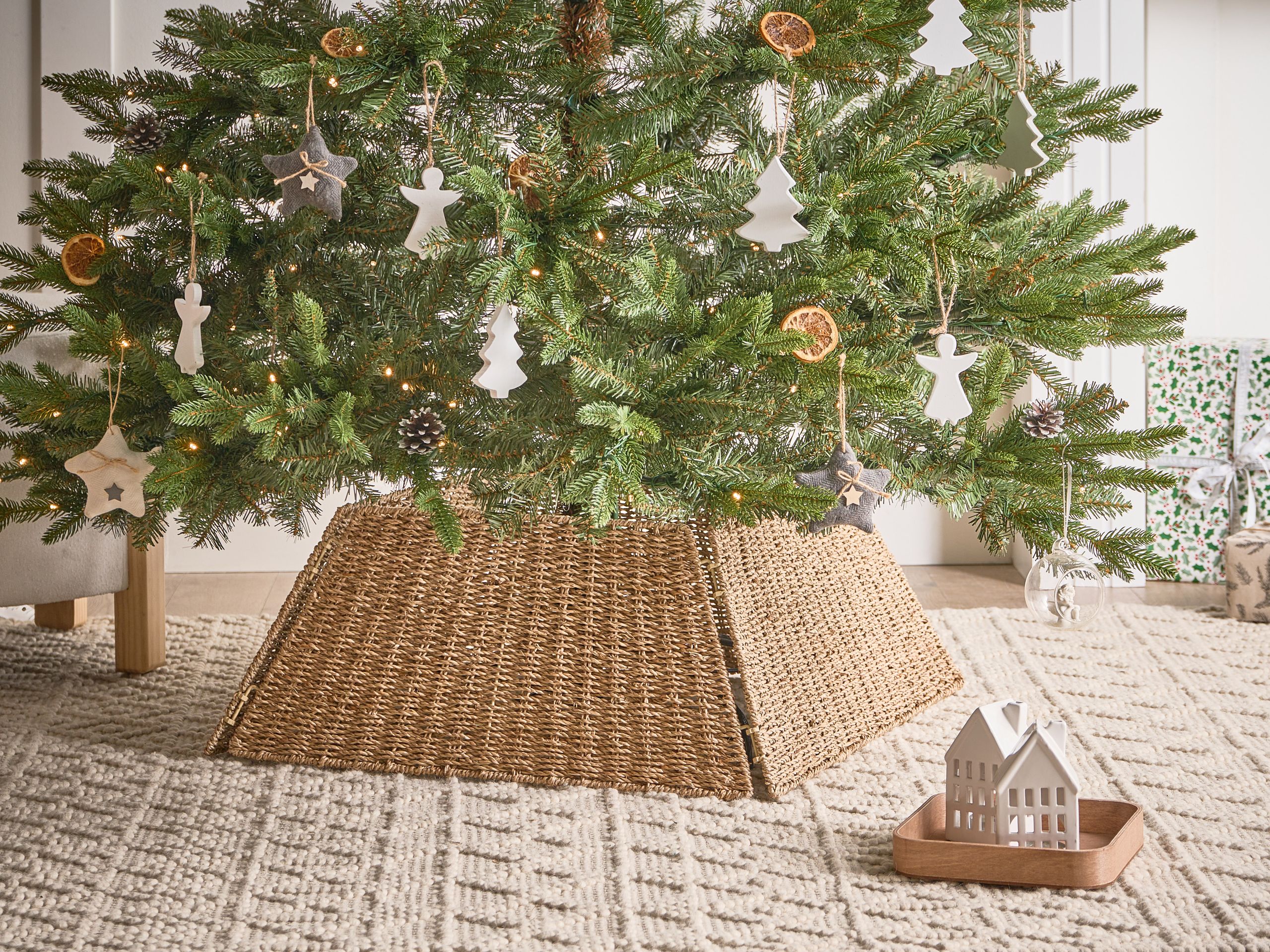 Käsintehty nelikulmainen joulukuusen kaulus. Tuo kotiin sesongin henkeä tällä kauniisti punotulla kuusenjalan suojuksella, joka on valmistettu laadukkaasta meriruohosta. Huolella ja yksityiskohtaisesti käsintehty suojus on kestävä ja huokuu lämmintä, kodikasta tunnelmaa. Se on suunniteltu sopimaan monen kokoisten joulukuusen jalkojen kanssa, mikä tekee siitä täydellisen lisän joulusisustukseen.