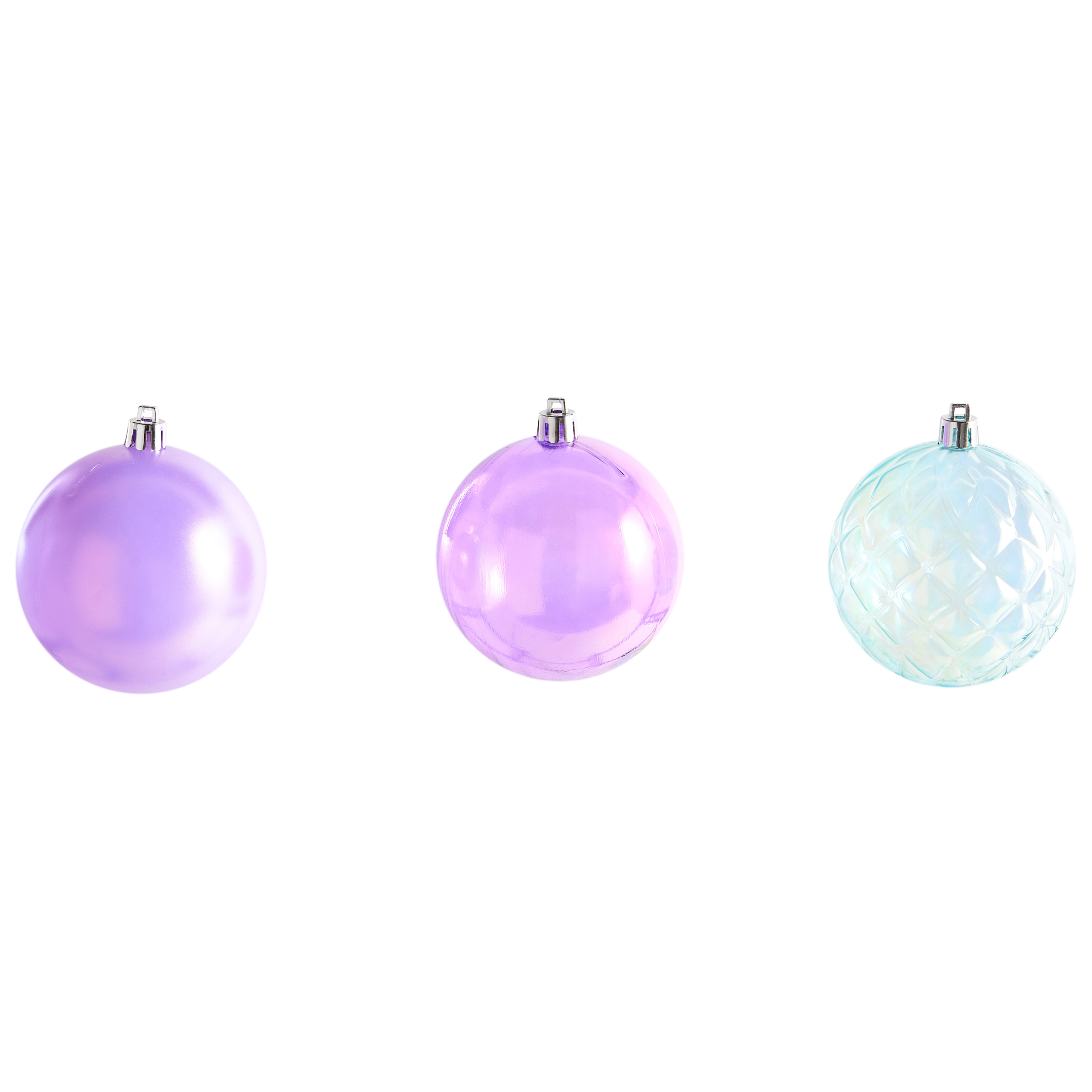 24-osainen moderni joulupallosetti. Tuo joulukoristeluun ripaus modernia taikaa tällä 24-osaisella kuusenkoristesetillä. Synteettisestä materiaalista valmistetut joulupallot ovat eteerisen värisiä, ja niissä yhdistyvät violetin, laventelin ja pehmeän sinisen sävyt. Koristepalloissa on erilaisia tekstuureja, jotka heijastavat valoa upeasti irisoivalla efektillä. Setti on täydellinen valinta niille, jotka etsivät moderneja, tyylikkäitä ja leikkisiä joulukoristeita.