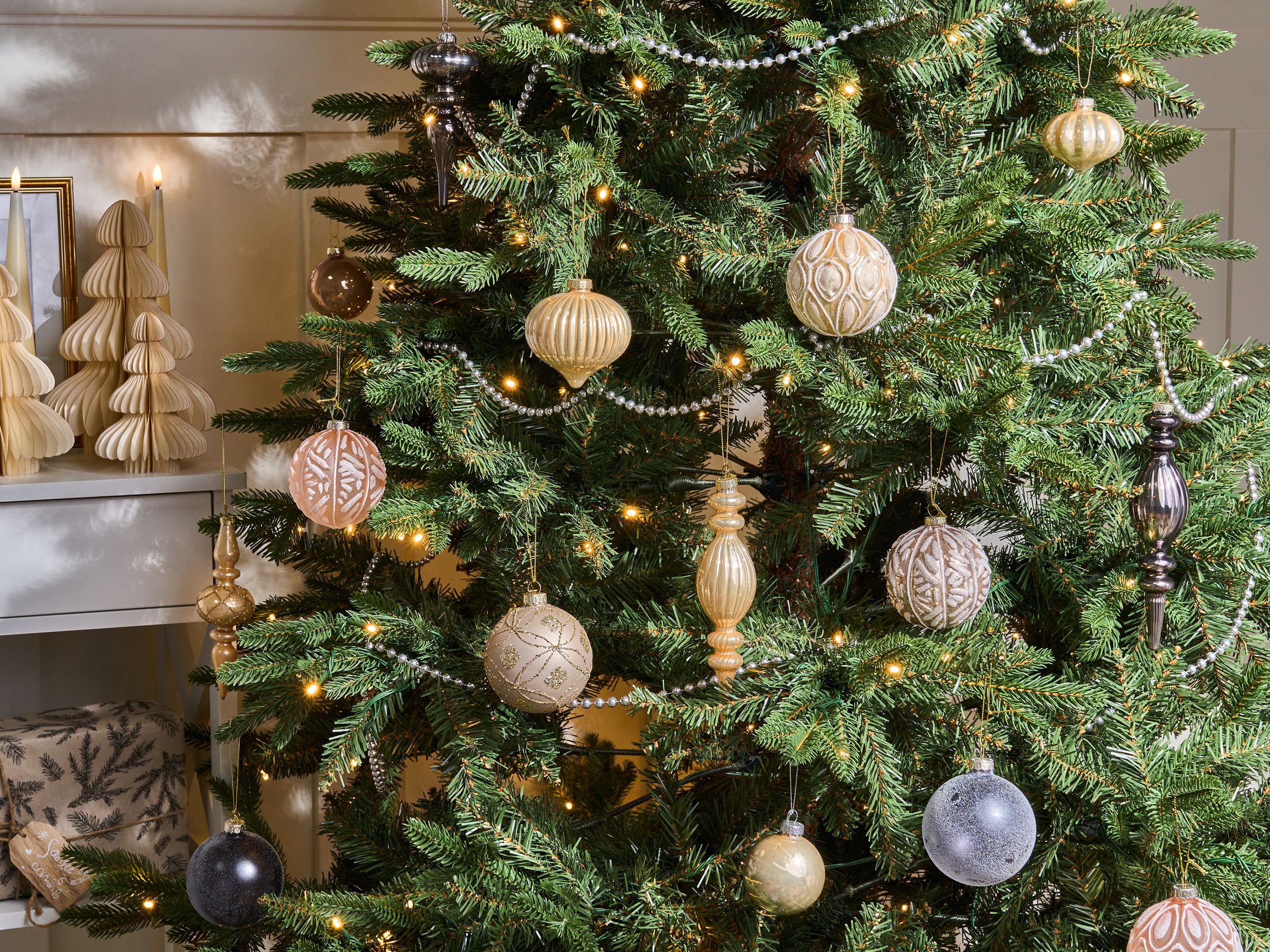 Käsintehty 24-osainen joulupallosetti. Lisää joulukoristeluun eleganttia ilmettä tällä 24-osaisella kuusenkoristesetillä, joka on käsin valmistettu lasista. Klassinen joulupallojen ja jääpuikon muotoisten koristeiden yhdistelmä luo perinteisen ilmeen, kun taas ruusukullan väri ja hopeiset korostukset lisäävät ripauksen glamouria. Hienostuneet kimaltelevat yksityiskohdat heijastavat valoa kauniisti, mikä lisää kuuseen syvyyttä ja kimallusta sekä luo kutsuvan joulutunnelman.