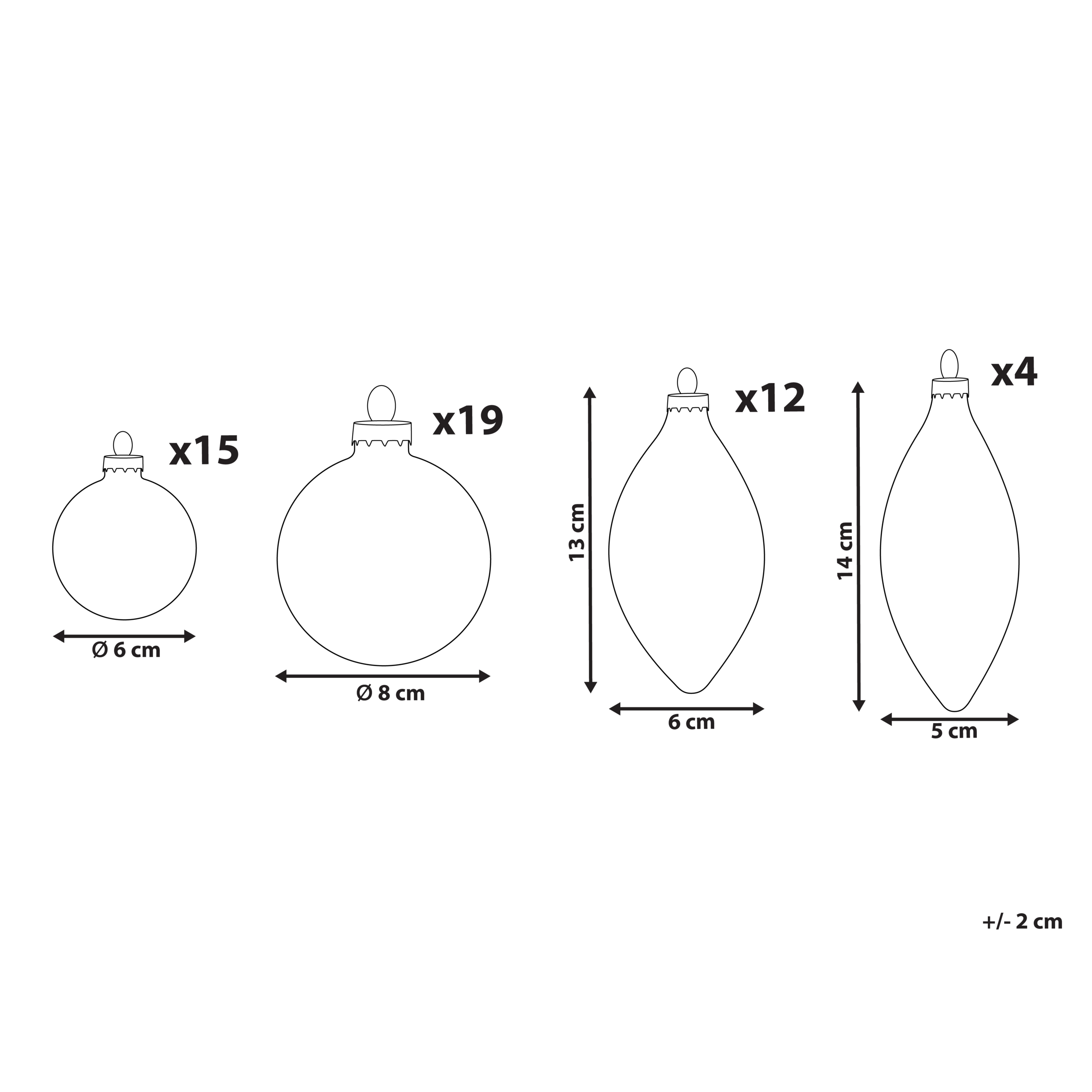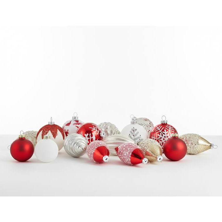 Käsintehty 50-osainen joulupallosetti. Koristele kuusi tällä upealla 50-osaisella kuusenkoristesetillä, joka on käsin valmistettu lasista. Viehättävä pyöreiden, ovaalien ja kävynmuotoisten joulupallojen yhdistelmä, joissa kimaltelevat yksityiskohdat ja jouluiset kuviot yhdistyvät klassiseen valkoiseen ja punaiseen. Koristepallot heijastavat valoa kauniisti ja luovat lumoavan, talvista ihmemaailmaa huokuvan tunnelman.