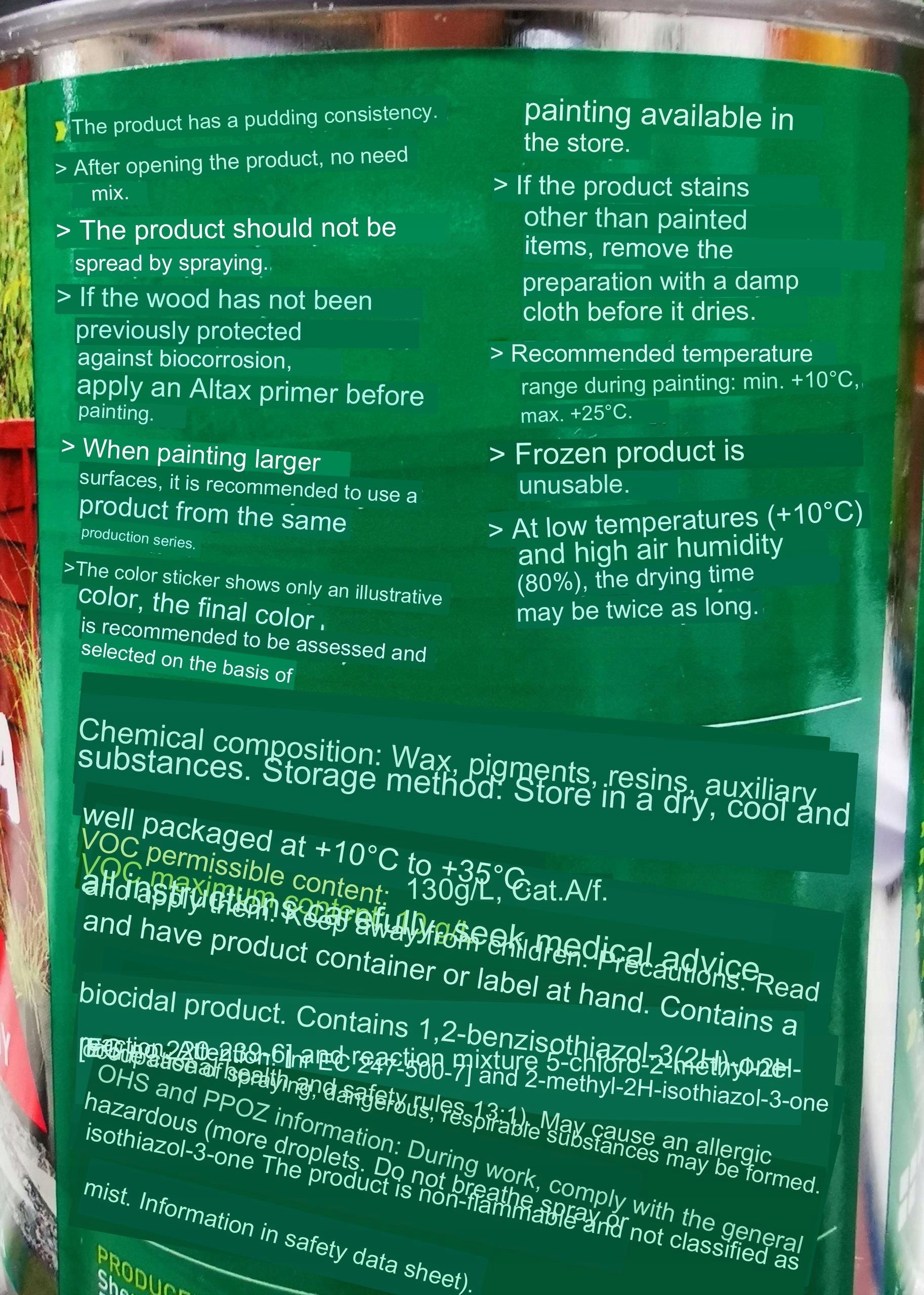 - Emme suosittele tätä tuotetta huonekalujen tai hienoksi hiotun puun maalaamiseen.