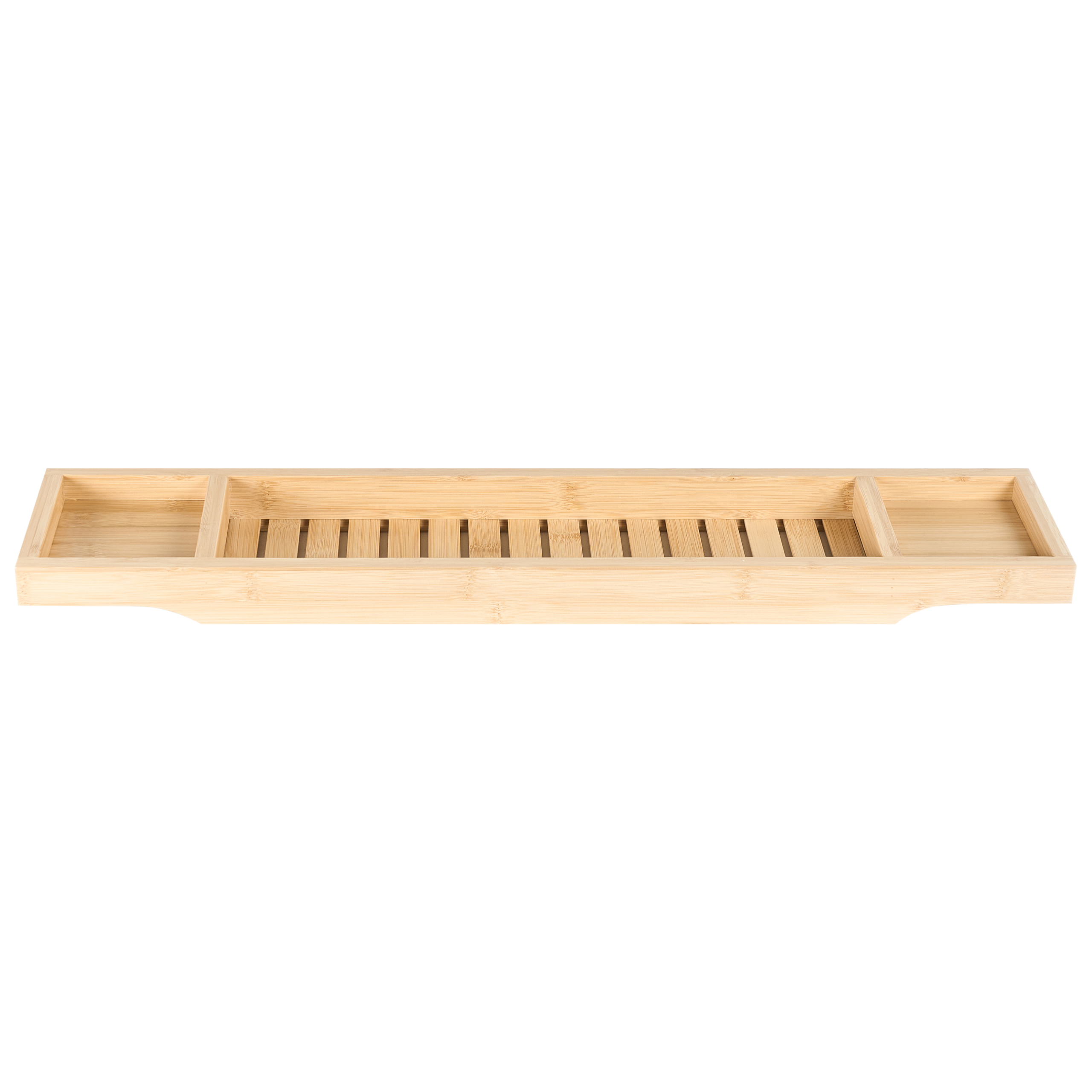 Minimalistinen monikäyttöinen ammetarjotin. Tämä luonnollisesta bambusta valmistettu kylpyammetarjotin tuo kylpyhuoneeseen ripauksen skandinaavista viehätystä ja pitää välttämättömät tavarat käden ulottuvilla kylvyn aikana. Virtaviivainen muotoilu sopii erinomaisesti saippuoille ja muille hygieniatuotteille, minkä ansiosta tarjotin on sekä käytännöllinen että tyylikäs. Pieni mutta kätevä tarjotin on täydellinen lisävaruste, joka kohottaa kylpykokemustasi.