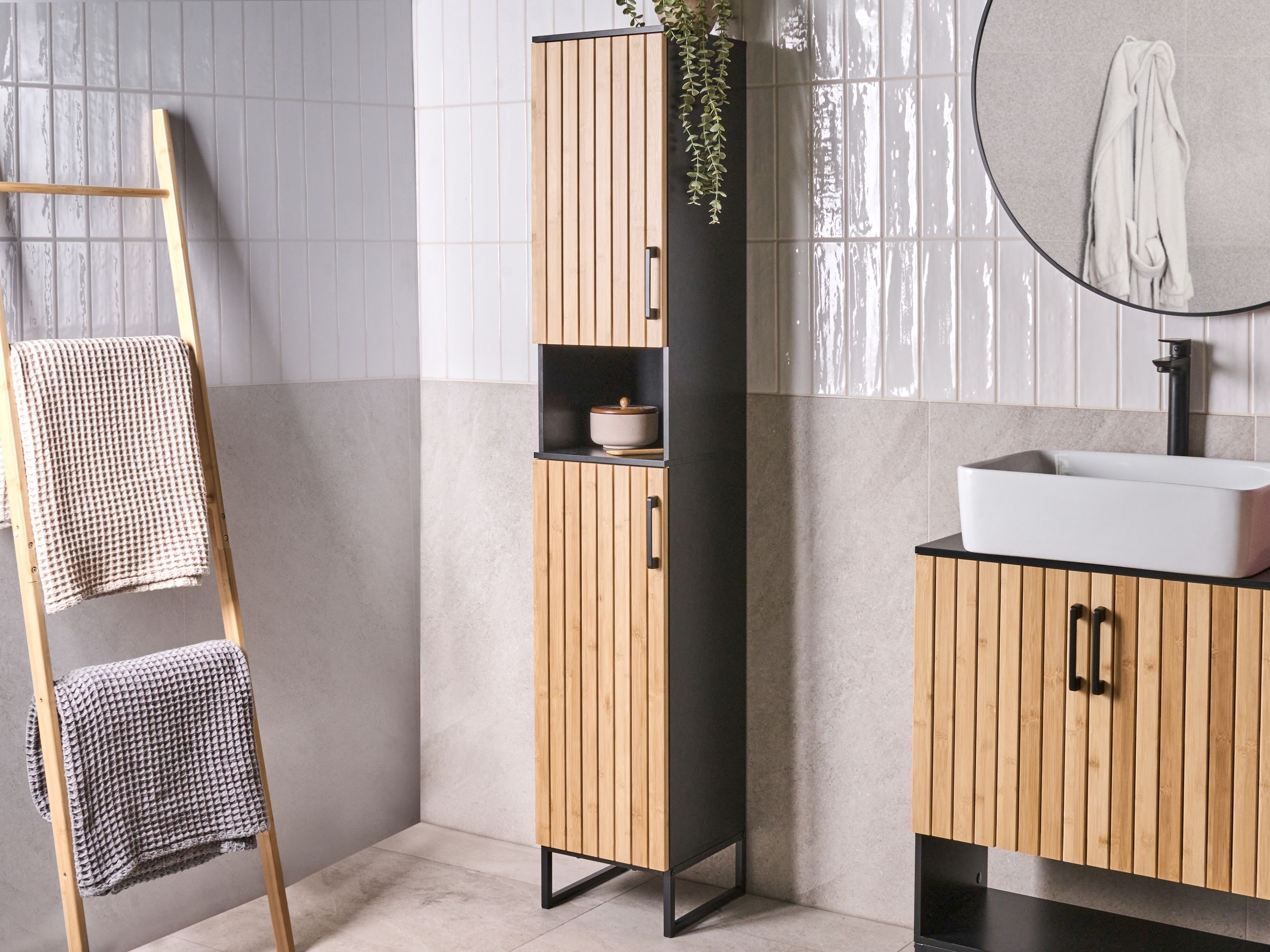 Moderni korkea kylpyhuoneen kaappi hyllyillä. Tämä korkea kylpyhuonekaappi on suunniteltu maksimoinaan käytettävissä oleva tila. Siinä on kuusi tilavaa hyllyä, jotka tarjoavat runsaasti tilaa kaikille välttämättömille kylpyhuoneen tarvikkeille. Kaapin etuosat on valmistettu bambusta ja runko tukevasta MDF-levystä ja teräksestä, mikä tekee siitä sekä kestävän että vakaan. Modernilla viimeistelyllään se on käytännöllinen ja tyylikäs lisä mihin tahansa kylpyhuoneeseen.