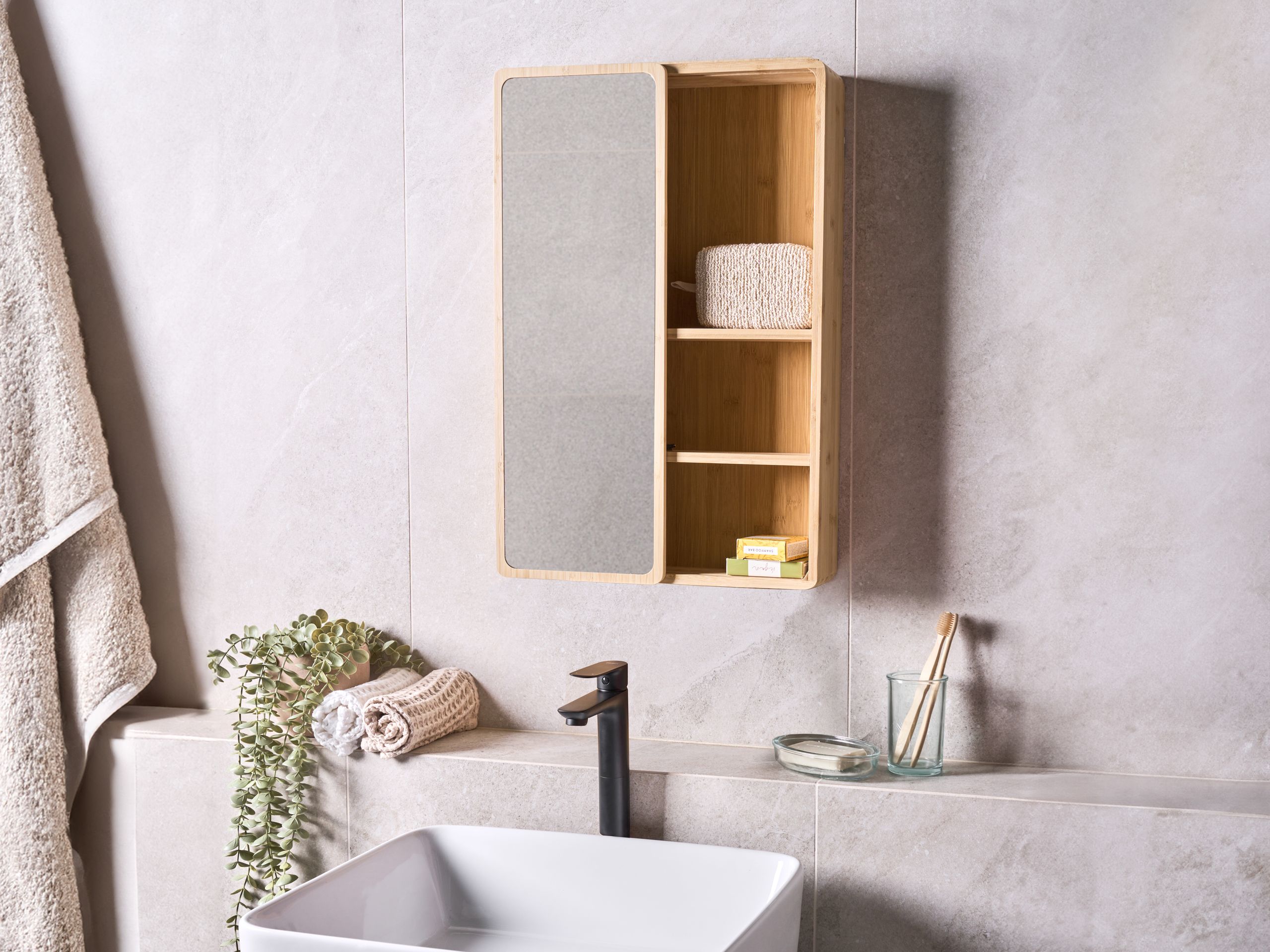 Moderni kylpyhuoneen kaappi peilillä ja hyllyillä. Tämä kylpyhuoneen peilikaappi on käytännöllinen ja tyylikäs säilytysratkaisu. Se on valmistettu luonnollisesta bambusta, jossa yhdistyvät kestävyys ja moderni ilme. Liukuva peiliovi liikkuu molempiin suuntiin, joten hyllyihin pääsee kätevästi käsiksi ilman, että ovea tarvitsee kääntää auki. Täydellinen kosmetiikan, lääkkeiden tai muiden pienten kylpyhuonetarvikkeiden säilytykseen.