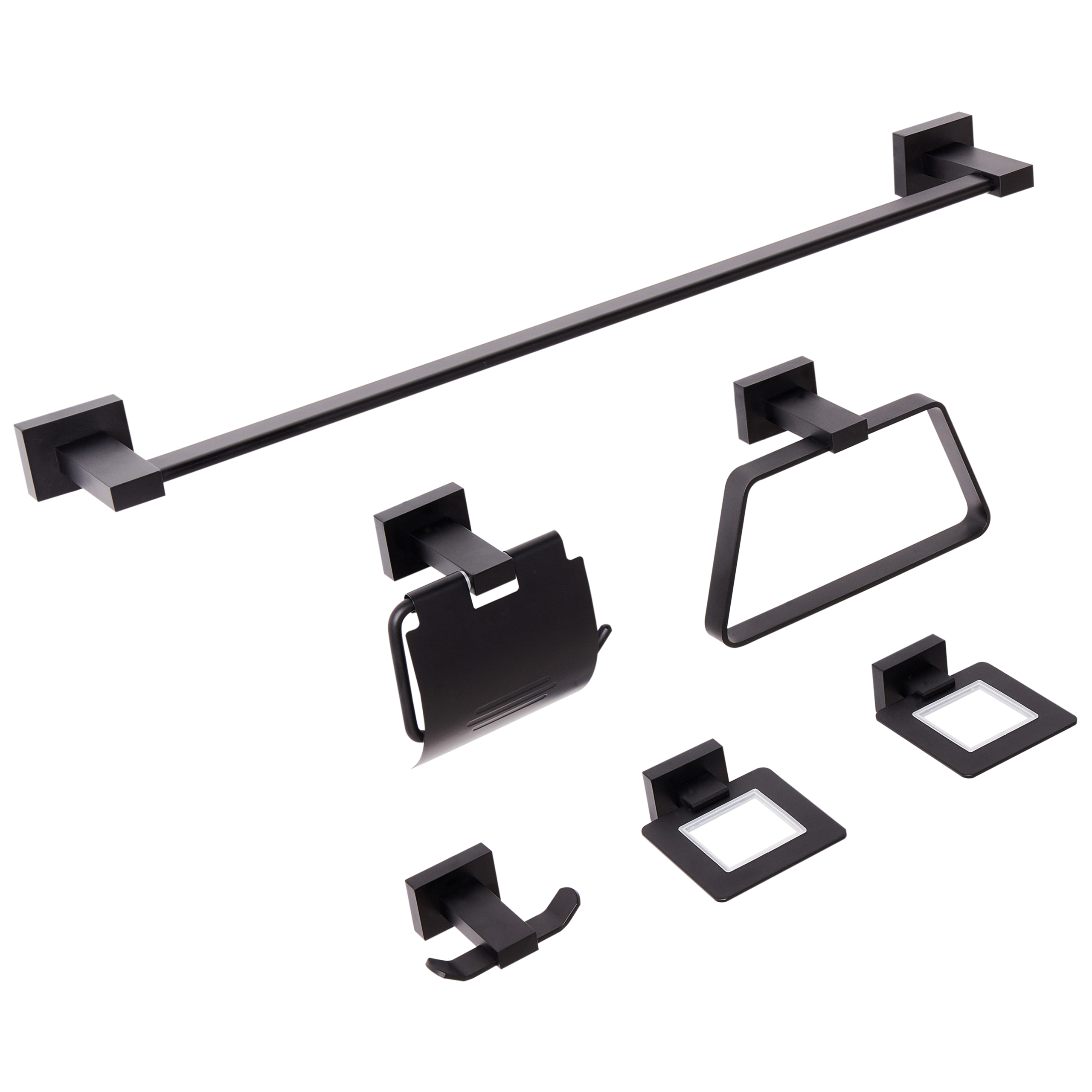 Moderni tarvikesetti kylpyhuoneen seinälle. Pidä kylpyhuone järjestyksessä ja tyylikkäänä tällä modernilla kylpyhuoneen tarvikesetillä. Se on valmistettu laadukkaasta alumiinista, jonka elegantti mattamusta viimeistely tuo tilaan siistin ja yhtenäisen ilmeen. Settiin kuuluu kuusi osaa – pyyhekoukku, -tanko ja -rengas sekä pidikkeet saippua-astialle, vesilasille ja wc-paperille – jotka ovat kestäviä ja helppoja asentaa. Lisäksi mukana ovat lasinen saippuapidike ja vesilasi, jotka viimeistelevät kokonaisuuden.