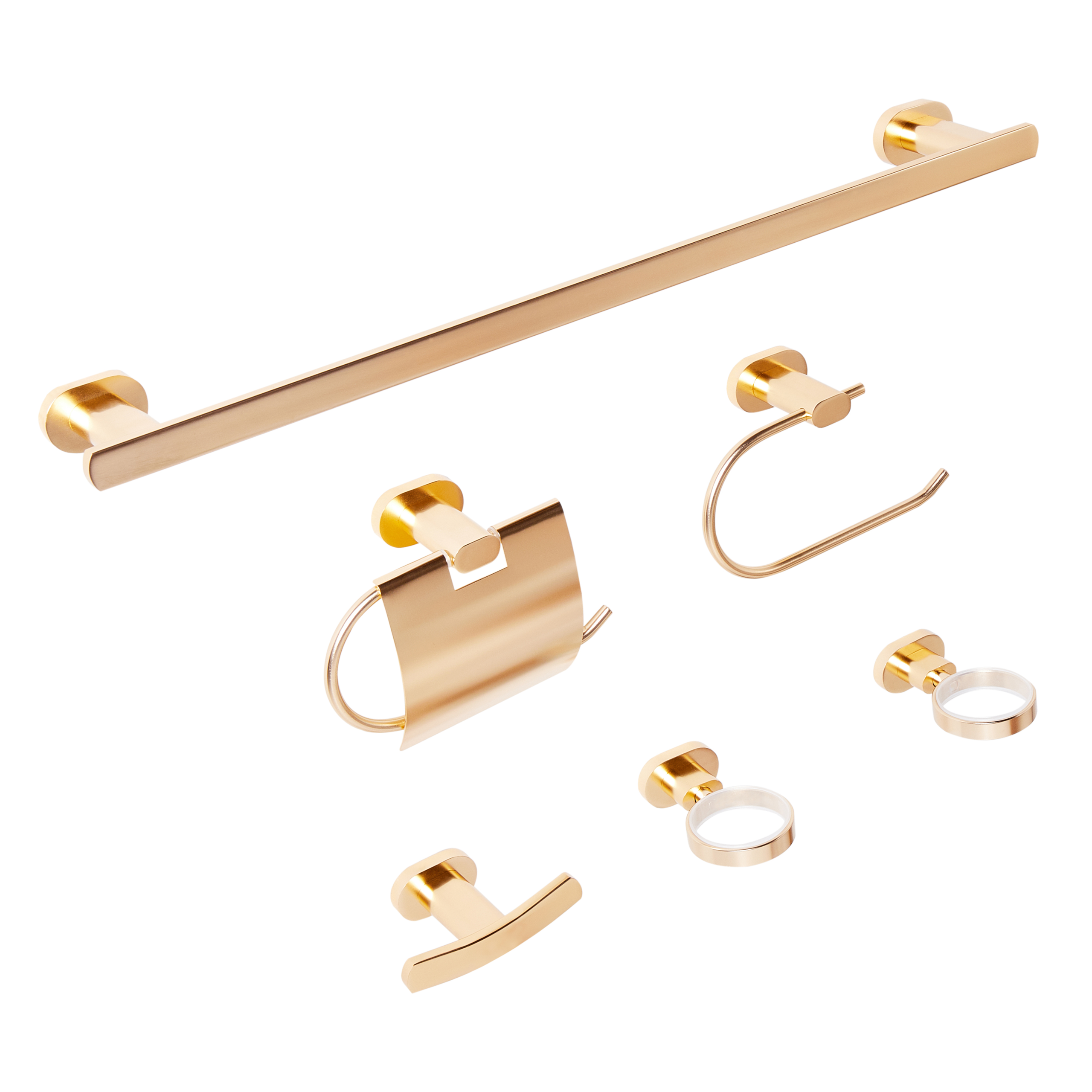 Moderni tarvikesetti kylpyhuoneeseen. Tämä kylpyhuoneen tarvikesetti on yksinkertainen mutta elegantti valinta jokaiseen kylpyhuoneeseen. Se on valmistettu laadukkaasta alumiinista, jonka klassinen kultainen väri ja kiiltävä viimeistely saavat setin sulautumaan vaivattomasti moniin sisustuksiin. Settiin kuuluu kuusi osaa – pyyhetanko, -rengas ja -koukku sekä pidikkeet saippua-astialle, vesilasille ja wc-paperirullalle – jotka on helppo ja nopea asentaa seinälle. Mukana tulevat myös lasinen saippuapidike ja vesilasi, mikä tekee kokonaisuudesta yhtenäisen ja esteettisesti miellyttävän.