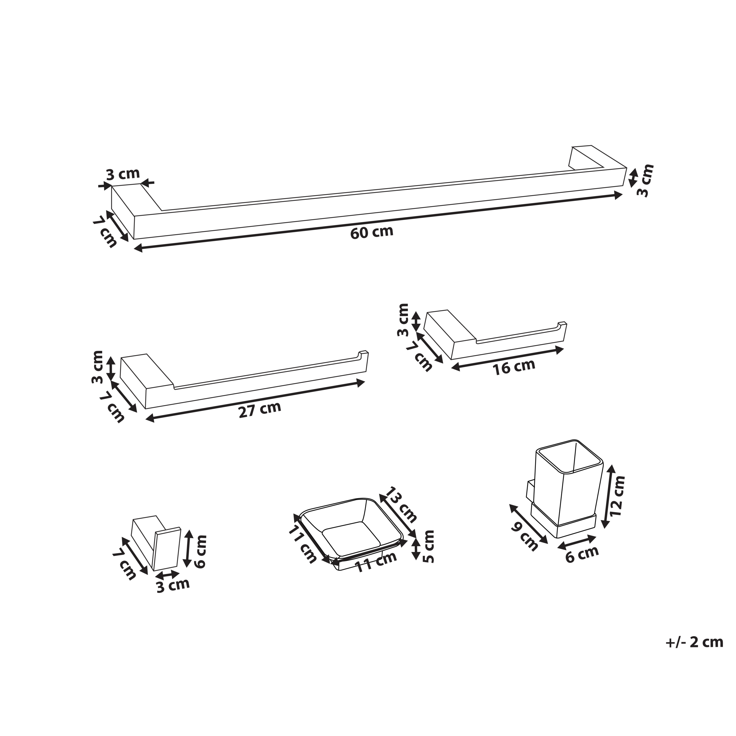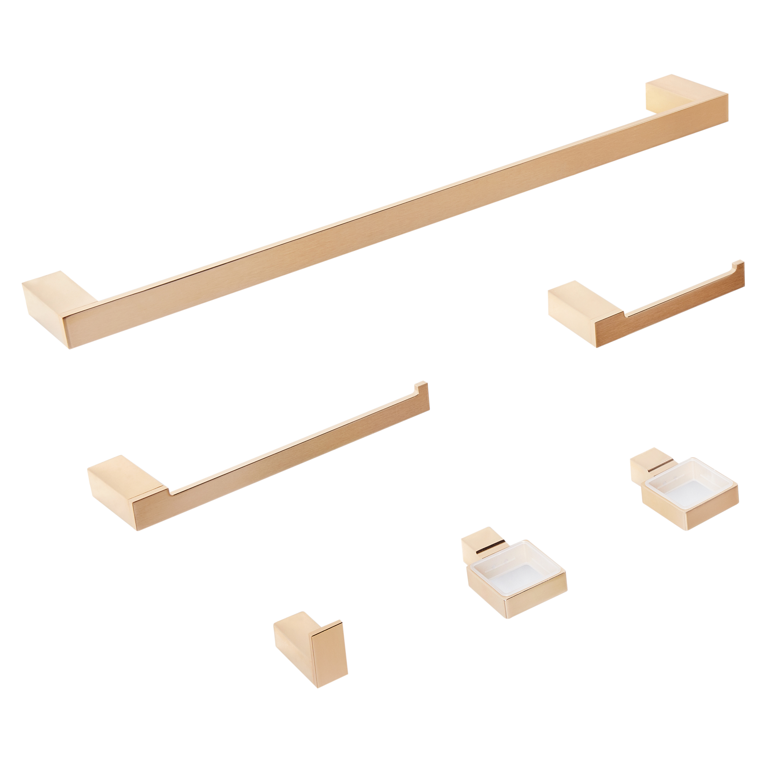 Minimalistinen seinään kiinnitettävä tarvikesetti kylpyhuoneeseen. Pidä kylpyhuoneen tärkeimmät tarvikkeet järjestyksessä tällä kuusiosaisella tarvikesetillä, johon kuuluu kaksi pyyhetankoa, wc-paperiteline, saippua-astian pidike, lasipidike ja pyyhekoukku. Jokainen osa on valmistettu kestävästä alumiinista, ja mukana tulevat myös lasinen saippuapidike ja vesilasi. Moderni, minimalistinen muotoilu ja kiiltävä kullanvärinen viimeistely sulautuvat saumattomasti monenlaisiin sisustuksiin. Setti on täydellinen valinta nykyaikaisen, yhtenäisen ja siistin kylpyhuoneen luomiseen.