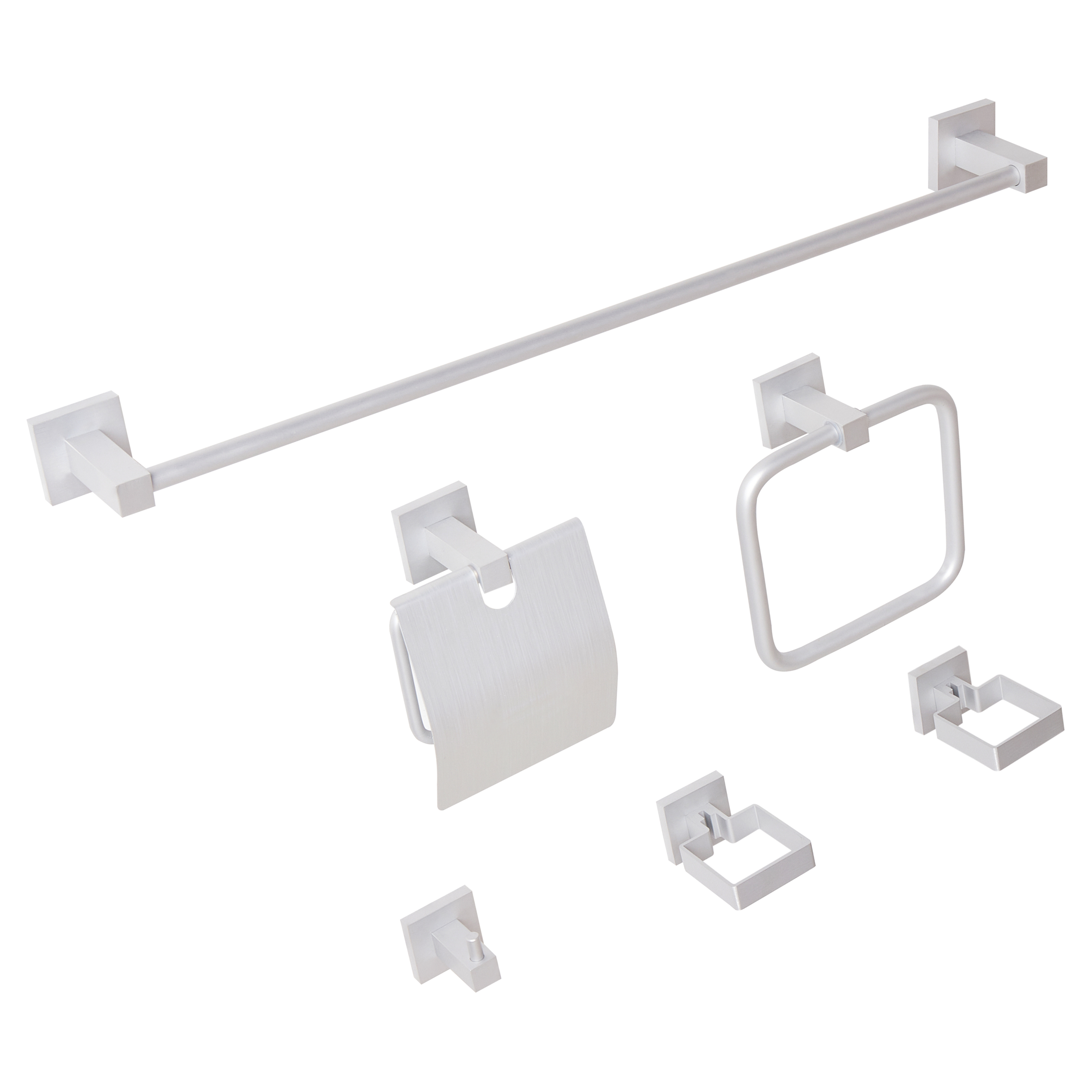 Seinään kiinnitettävä tarvikesetti kylpyhuoneeseen. Kohota kylpyhuoneen ilmettä tällä tyylikkäällä kuusiosaisella tarvikesetillä. Se on valmistettu kestävästä alumiinista, jonka klassinen hopeanvärinen mattaviimeistely sulautuu vaivattomasti sekä moderneihin että perinteisiin sisustuksiin. Setti sisältää pyyhetangon, -renkaan ja -koukun sekä pidikkeet wc-paperille, vesilasille ja saippua-astialle. Mukana tulevat myös lasinen saippuapidike ja vesilasi, jotka viimeistelevät kokonaisuuden ja tekevät setistä toimivan valinnan kylpyhuoneen järjestyksen ja siisteyden ylläpitämiseen.