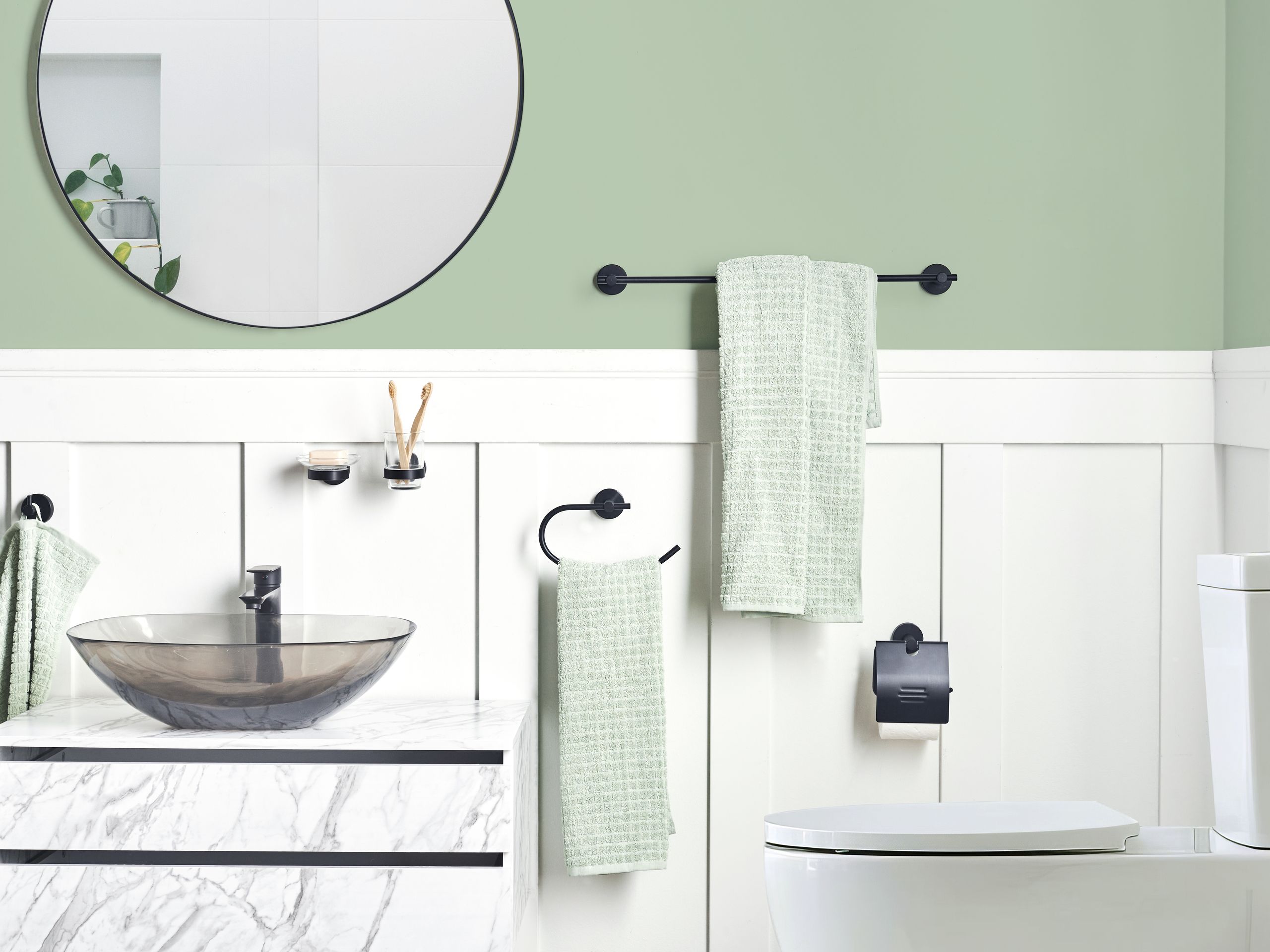 Moderni seinään kiinnitettävä tarvikesetti kylpyhuoneeseen. Tuo kylpyhuoneeseen tyyliä tällä elegantilla, mattaviimeistellyllä kylpyhuoneen tarvikesetillä, joka on valmistettu alumiinista. Settiin kuuluu pyyhetanko, -koukku ja -rengas sekä erilliset pidikkeet saippua-astialle, vesilasille ja wc-paperille, joten se on erinomainen valinta kylpyhuoneen järjestyksen ja siisteyden ylläpitämiseen. Tyylikäs muotoilu täydentää mitä tahansa sisustustyyliä, ja mukana tulevat lasinen saippuapidike ja vesilasi tuovat arkeen ripauksen käytännöllisyyttä.