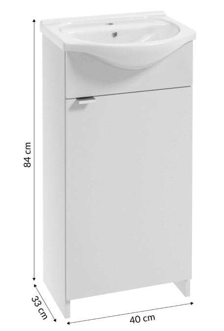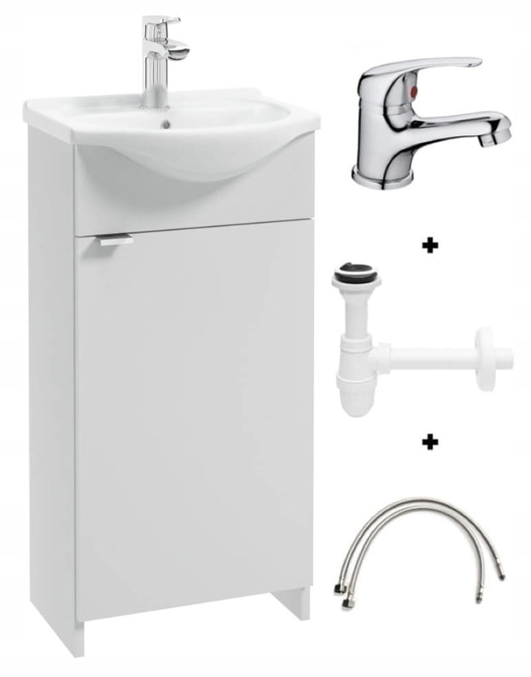 Kylpyhuonekaappi 40 cm pesualtaalla, vapaasti seisova, valkoinen, sifonilla ja kromihanalla, Kredo