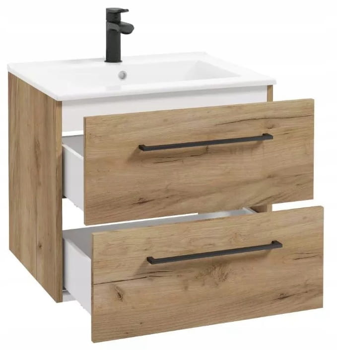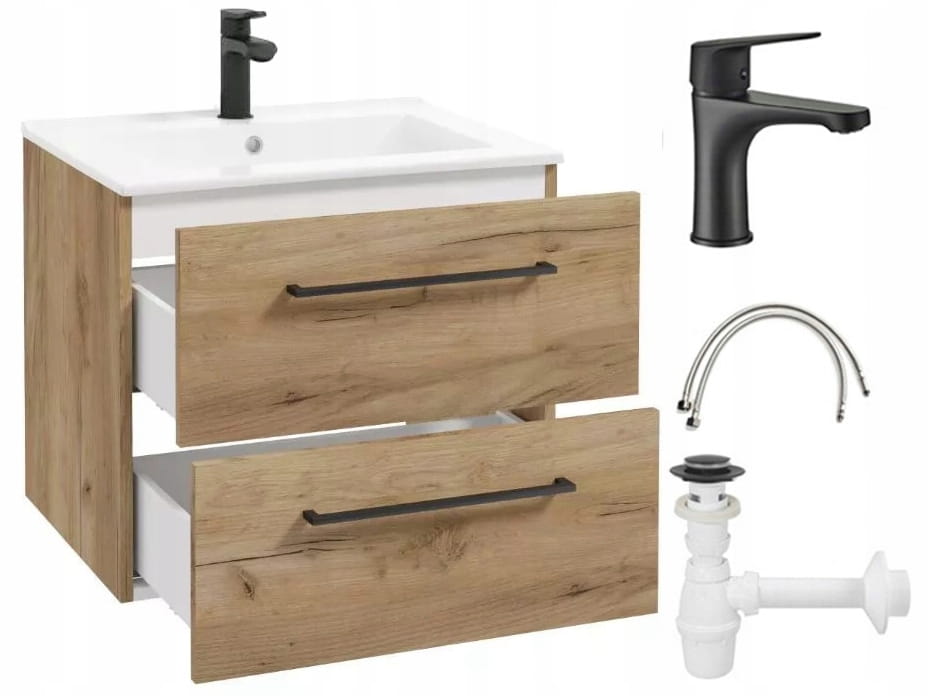 Täydellinen setti– Setti sisältää kaiken kokoamiseen tarvittavan: pesualtaan, kaapin, sifonin ja mustan hanan, joten ostosten tekeminen on helppoa ja kätevää.