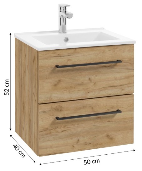Kylpyhuonekaappi 50 cm ripustetulla pesualtaalla, askartelutammea, hana ja Pinia-sifoni