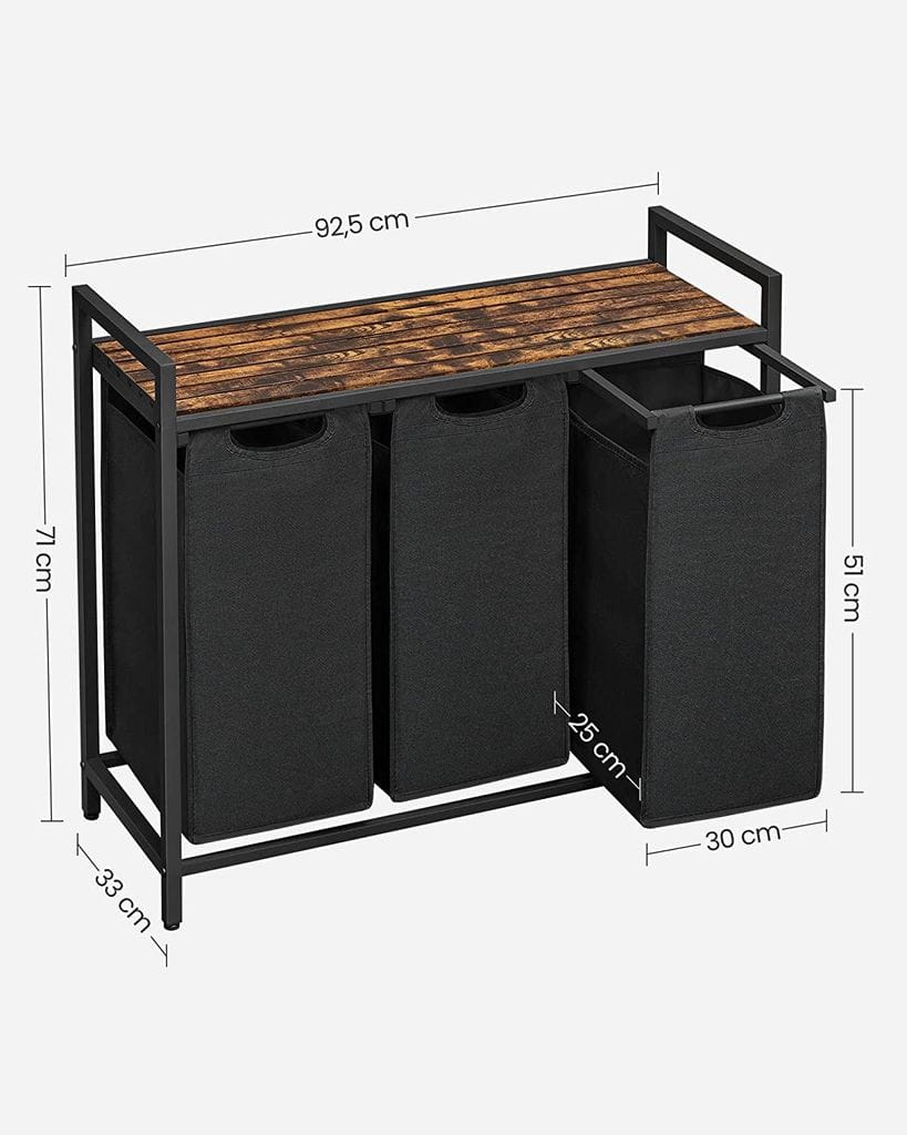 Tämä käytännöllinen, kolmilokeroinen pyykki- ja liinavaatekori, jonka kokonaistilavuus on 114 litraa, on valmistettu tyylikkäistä MDF-säleistä, jotka on yhdistetty teräsrungolla. Huolellinen materiaalivalinta tekee tuotteesta kestävän.