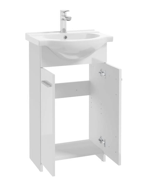 ➡️Tässä Marlena-sarjan 50 cm leveässä kylpyhuonesetissä on lakattu etuosatäydellinen pieniin kylpyhuoneisiin. Tämä kaappi vapauttaa hieman säilytystilaa ja lisää huoneeseen ripauksen nykyaikaisuutta.Valkoiseksi lakattu etuosaja pieni pesuallas täydentävät täydellisesti kaikentyyppisiä kalusteita ja laattojen värejä, ja huonekalujen pieni koko lisää tilan tuntua huoneeseen.