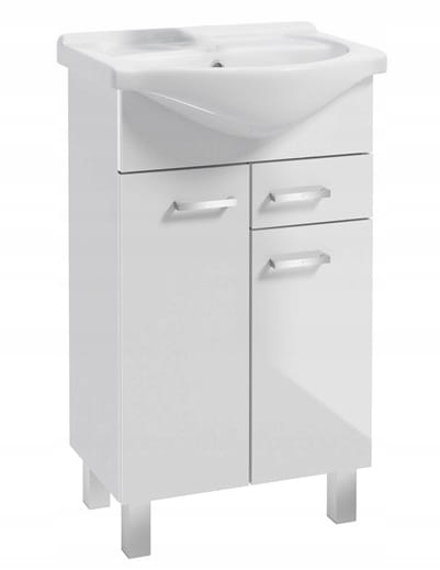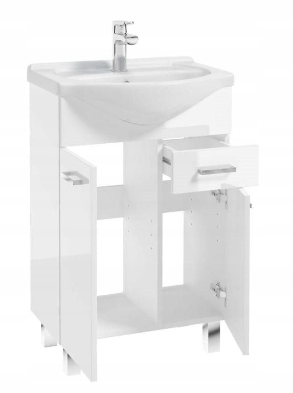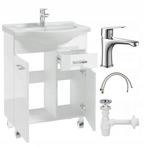 Vapaasti seisova kylpyhuoneen kaappi pesualtaalla, hanalla ja sifonilla, 55 cm, kiiltävä valkoinen