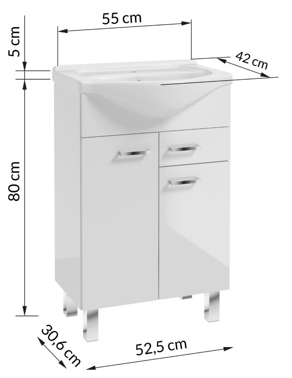 Mea kylpyhuonekaappi pesualtaalla, 55 cmon tyylikäs ja käytännöllinen setti, joka sopii täydellisesti pienempiin kylpyhuoneisiin. Valmistettu kestävästä modernin valkoisen värisestä huonekalulevystä, jossa on lakattu etupuoli,kaappi laajentaa visuaalisesti tilaa antaen sisustukseen siistin ja nykyaikaisen luonteen.