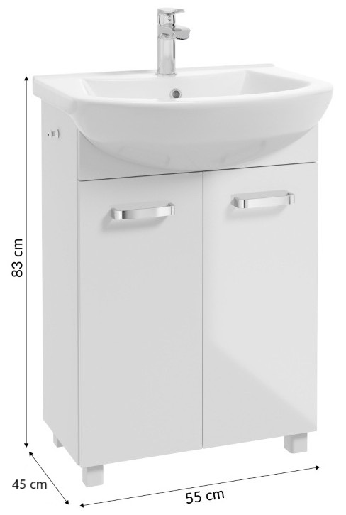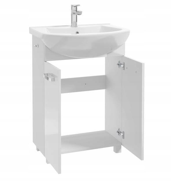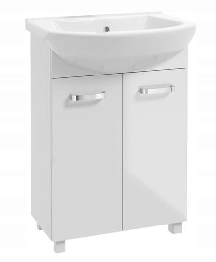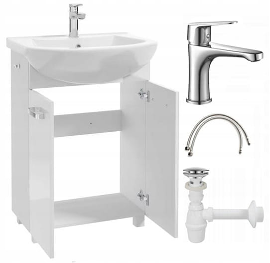 Kylpyhuonekaappi pesualtaalla, hanalla ja sifonilla, 60cm, vapaasti seisova, kiiltävä valkoinen