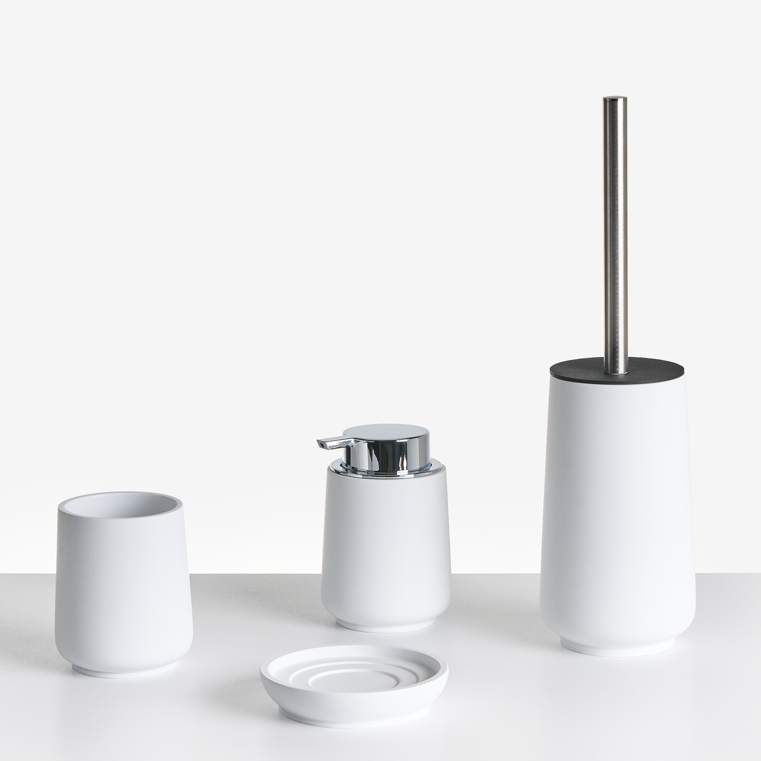 Monipuolinen kylpyhuoneen tarvikekokoelma. Pidä kylpyhuone siistin näköisenä ja vaivattoman tyylikkäänä tällä neliosaisella kylpyhuonesetillä. Se sisältää vessaharjan, vesilasin, saippua-annostelijan ja saippuapidikkeen, joka toimii erinomaisesti myös astiana koruille tai pikkutavaroille. Yksinkertainen, minimalistinen muotoilu sulautuu vaivattomasti monenlaisiin sisustuksiin, moderneista perinteisiin. Setti on toimiva mutta elegantti lisä minkä tahansa kokoiseen kylpyhuoneeseen.
