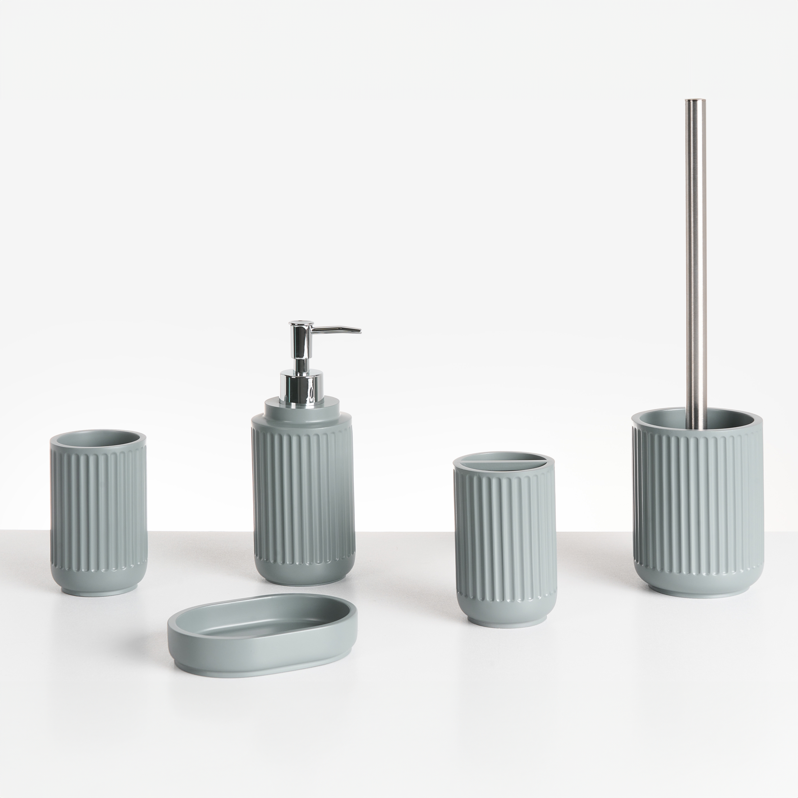 Uurrettu kylpyhuonesetti. Tämä käytännöllinen ja tyylikäs viisiosainen kylpyhuonesetti on täydellinen lisä jokaiseen moderniin kotiin. Setti sisältää kaikki välttämättömyydet: vesilasin, vessaharjan, hammasharjapidikkeen, saippua-annostelijan ja saippuapidikkeen. Tarvikkeet sopivat erinomaisesti kylpyhuoneen siistinä ja yhtenäisenä pitämiseen. Pinnan hienovaraiset uurteet lisäävät tilaan ripauksen eleganssia, ja laadukas viimeistely takaa pitkäikäisyyden.