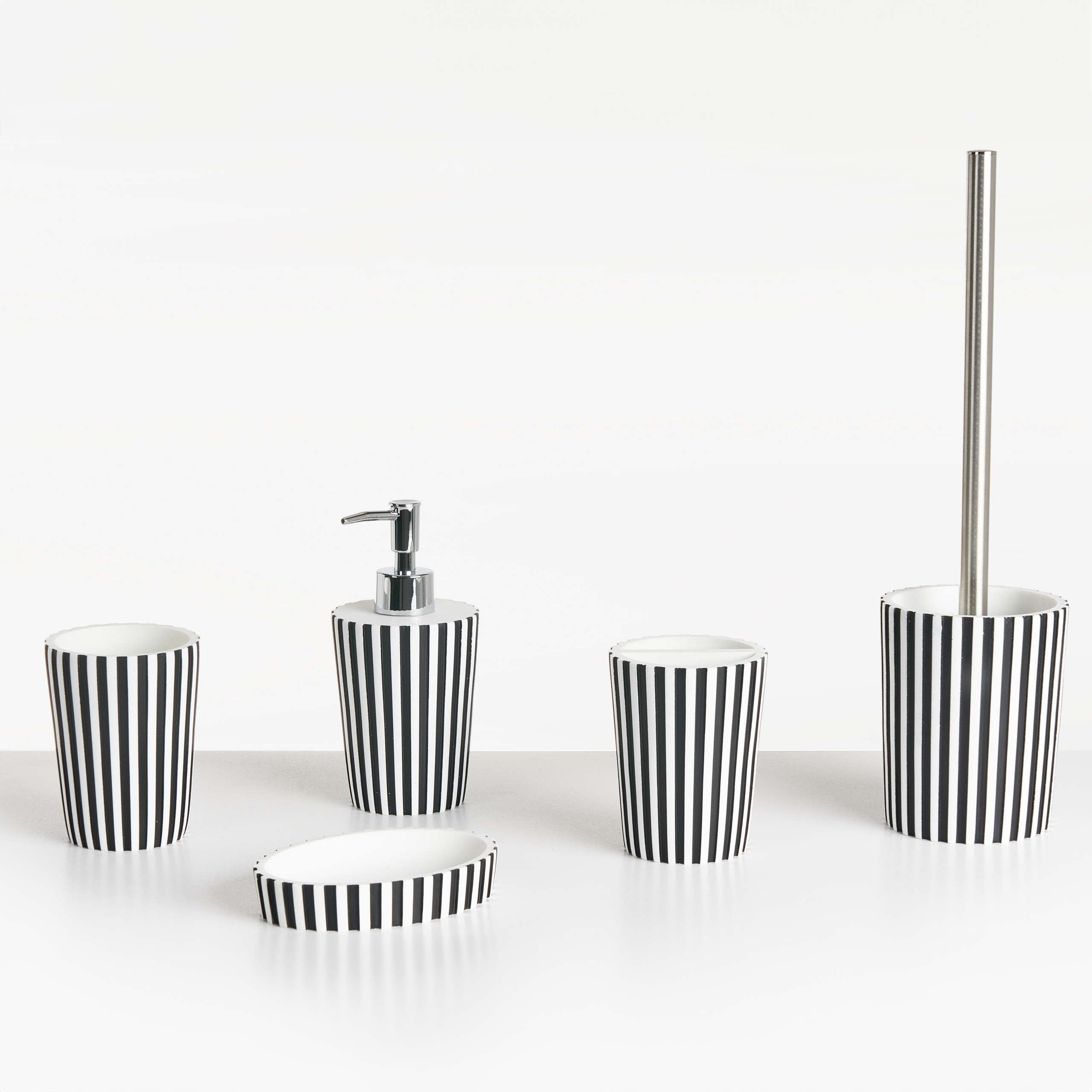 Moderni ja raidallinen kylpyhuonesetti. Tuo kylpyhuoneeseen tyylikästä ilmettä tällä viisiosaisella kylpyhuonesetillä, joka on suunniteltu tekemään tilasta yhtenäinen ja järjestetty. Settiin kuuluu vessaharja, vesilasi, hammasharjapidike, saippua-annostelija ja saippuapidike, jotka on valmistettu käsin polyhartsista ja viimeistelty pystysuorilla raidoilla. Kylpyhuonesetti sopii erinomaisesti monenlaisiin nykyaikaisiin sisustuksiin ja tarjoaa yksinkertaisen tavan kohottaa päivittäisiä askareita, pitäen samalla kaiken siististi paikoillaan.