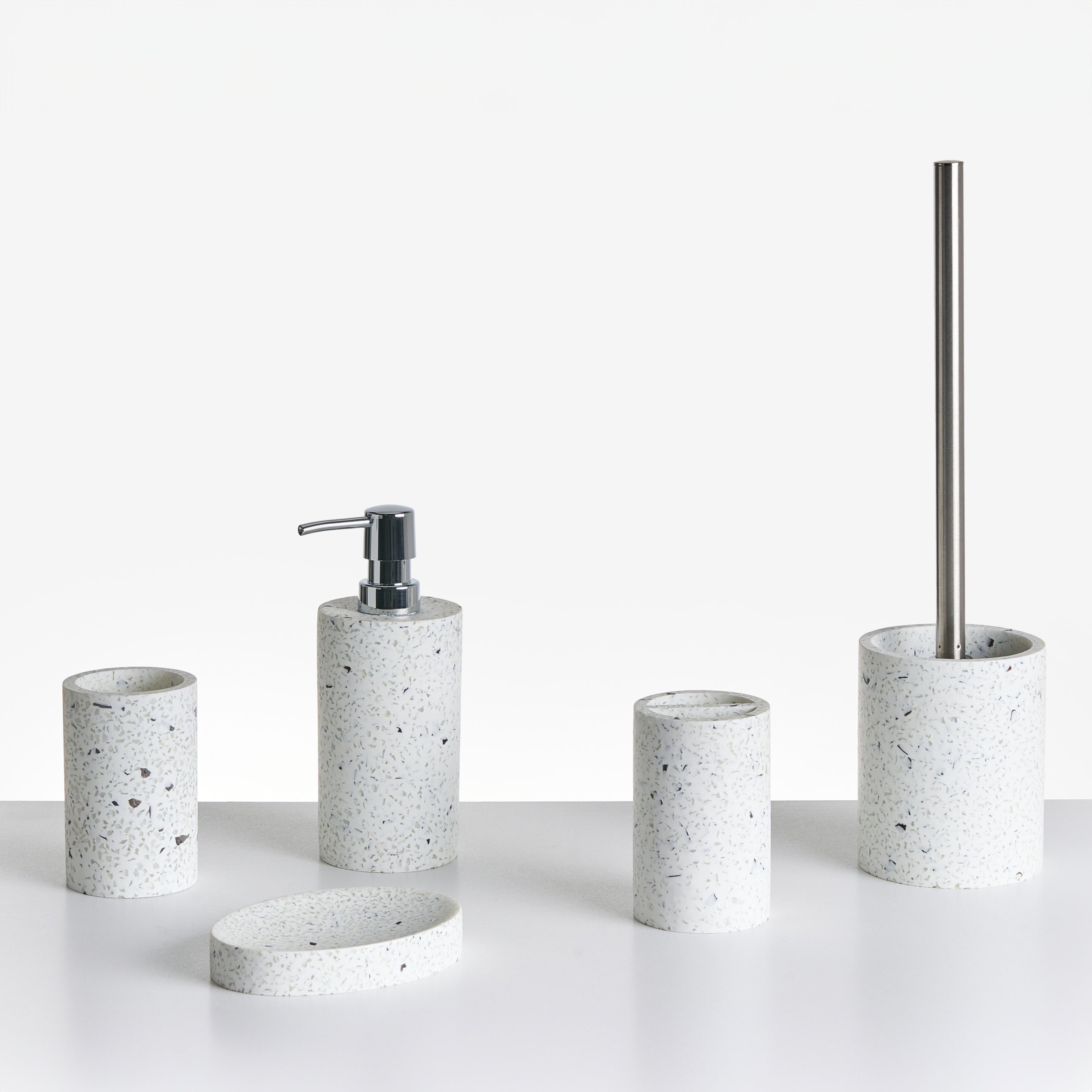 Moderni terrazzo-kuvioitu kylpyhuonesetti. Tämä viisiosainen kylpyhuonesetti on hurmaava lisä jokaiseen eleganttiin kylpyhuoneeseen, auttaen ylläpitämään tilan järjestystä tyylikkäällä ja käytännöllisellä tavalla. Setti sisältää hammasharjapidikkeen, vesilasin, vessaharjan, saippua-annostelijan ja saippuapidikkeen – kaikki, mitä tarvitset yhtenäisen ilmeen luomiseen. Kestävästä polyhartsista valmistetut tarvikkeet on viimeistelty kauniilla terrazzo-kuviolla, minkä ansiosta ne tuovat sisustukseen klassista viehätystä.