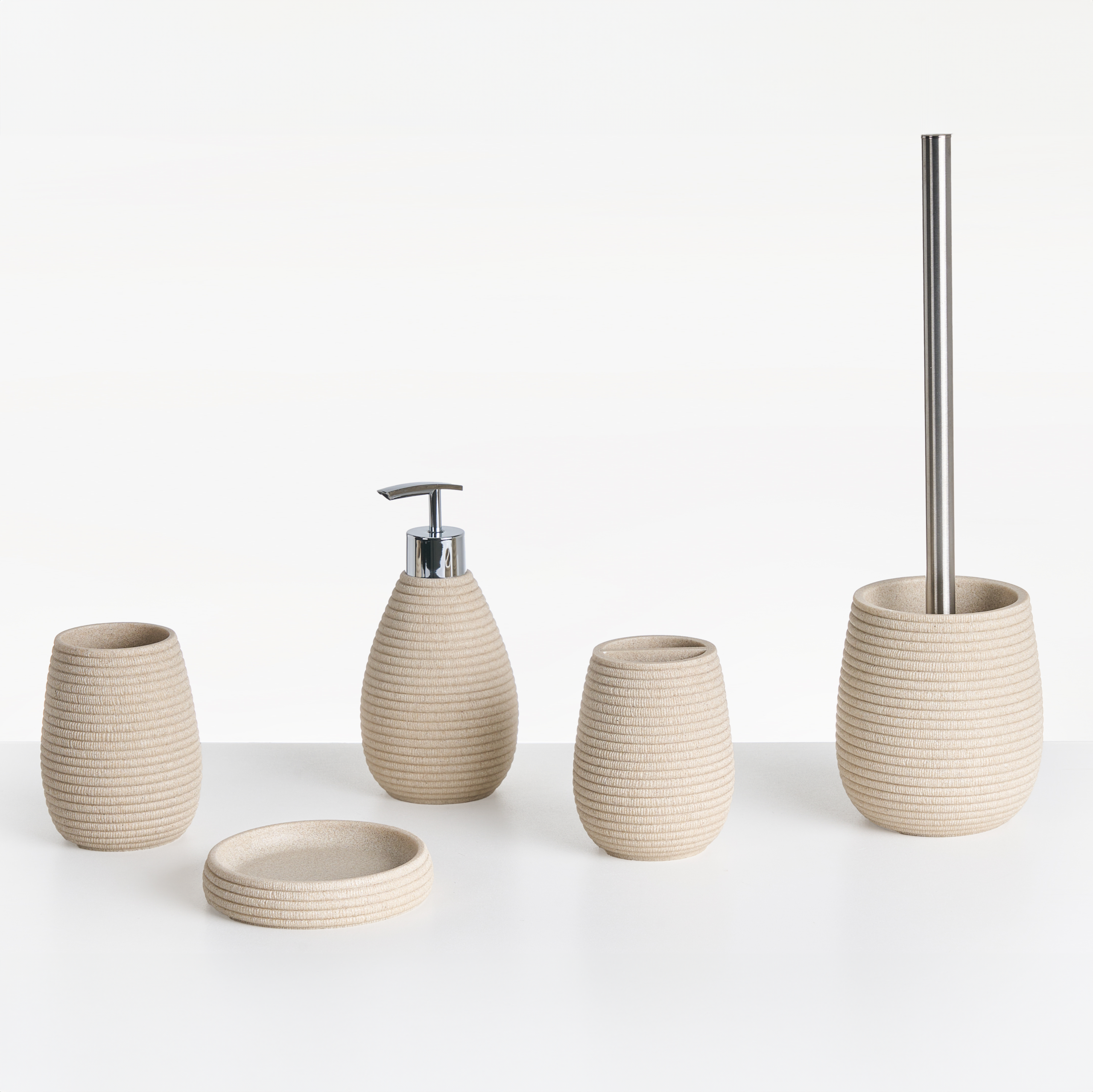 Kätevä setti kylpyhuoneeseen. Varusta kylpyhuone tällä yhtenäisellä kylpyhuonesetillä, joka on suunniteltu tuomaan tilaan rauhallinen ja harkittu ilme. Settiin kuuluu saippua-annostelija, saippuapidike, vessaharja, vesilasi ja hammasharjapidike, jotka on valmistettu käsin kestävästä polyhartsista ja viimeistelty kauniilla kohojuovaisella pinnalla ainutlaatuisen ulkonäön takaamiseksi. Neutraali, seesteinen sävy sulautuu vaivattomasti monenlaisiin sisustuksiin, ja setti pitää tasot siistinä ja järjestyksessä.