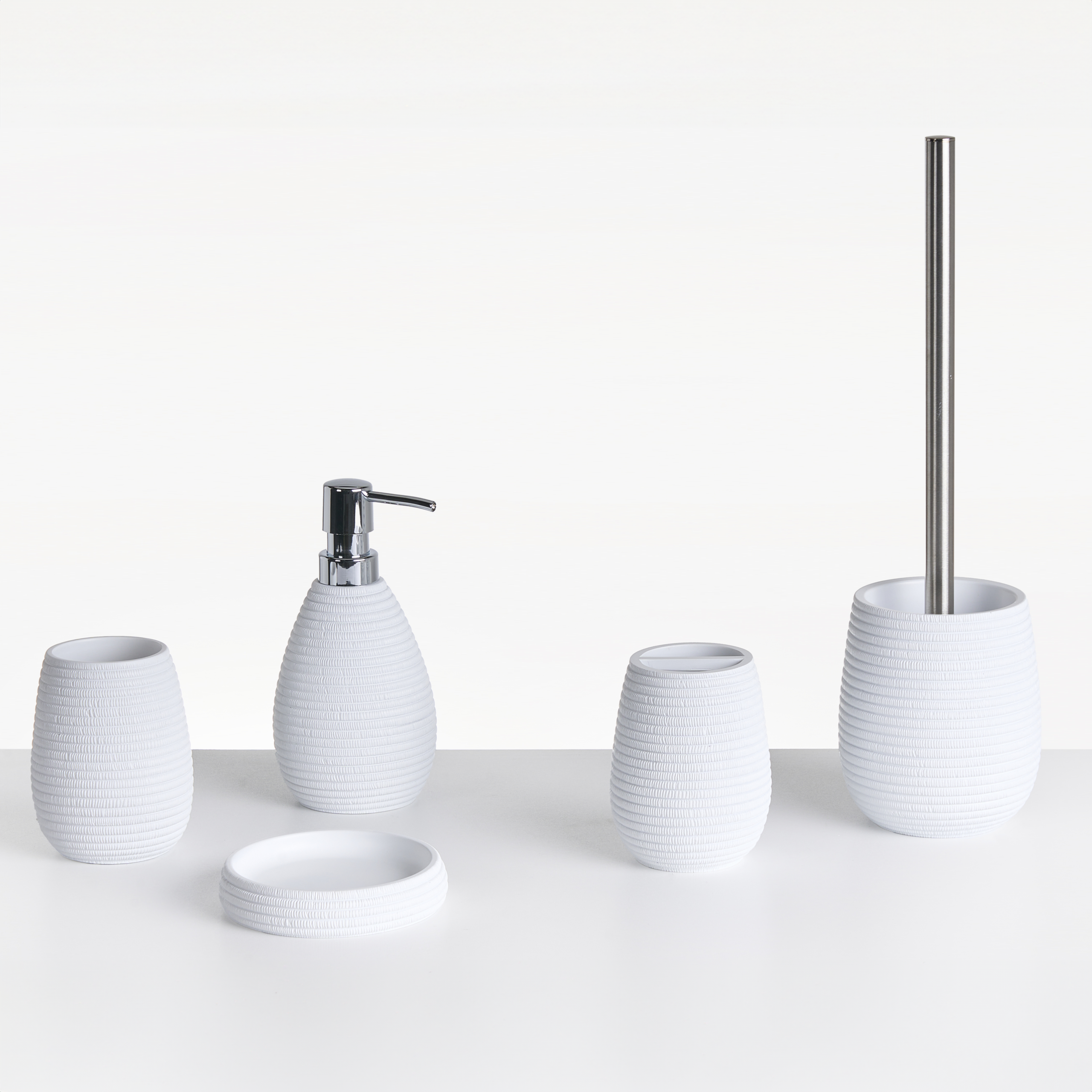 Kätevä setti kylpyhuoneeseen. Varusta kylpyhuone tällä yhtenäisellä kylpyhuonesetillä, joka on suunniteltu tuomaan tilaan rauhallinen ja harkittu ilme. Settiin kuuluu saippua-annostelija, saippuapidike, vessaharja, vesilasi ja hammasharjapidike, jotka on valmistettu käsin kestävästä polyhartsista ja viimeistelty kauniilla kohojuovaisella pinnalla ainutlaatuisen ulkonäön takaamiseksi. Neutraali, seesteinen sävy sulautuu vaivattomasti monenlaisiin sisustuksiin, ja setti pitää tasot siistinä ja järjestyksessä.