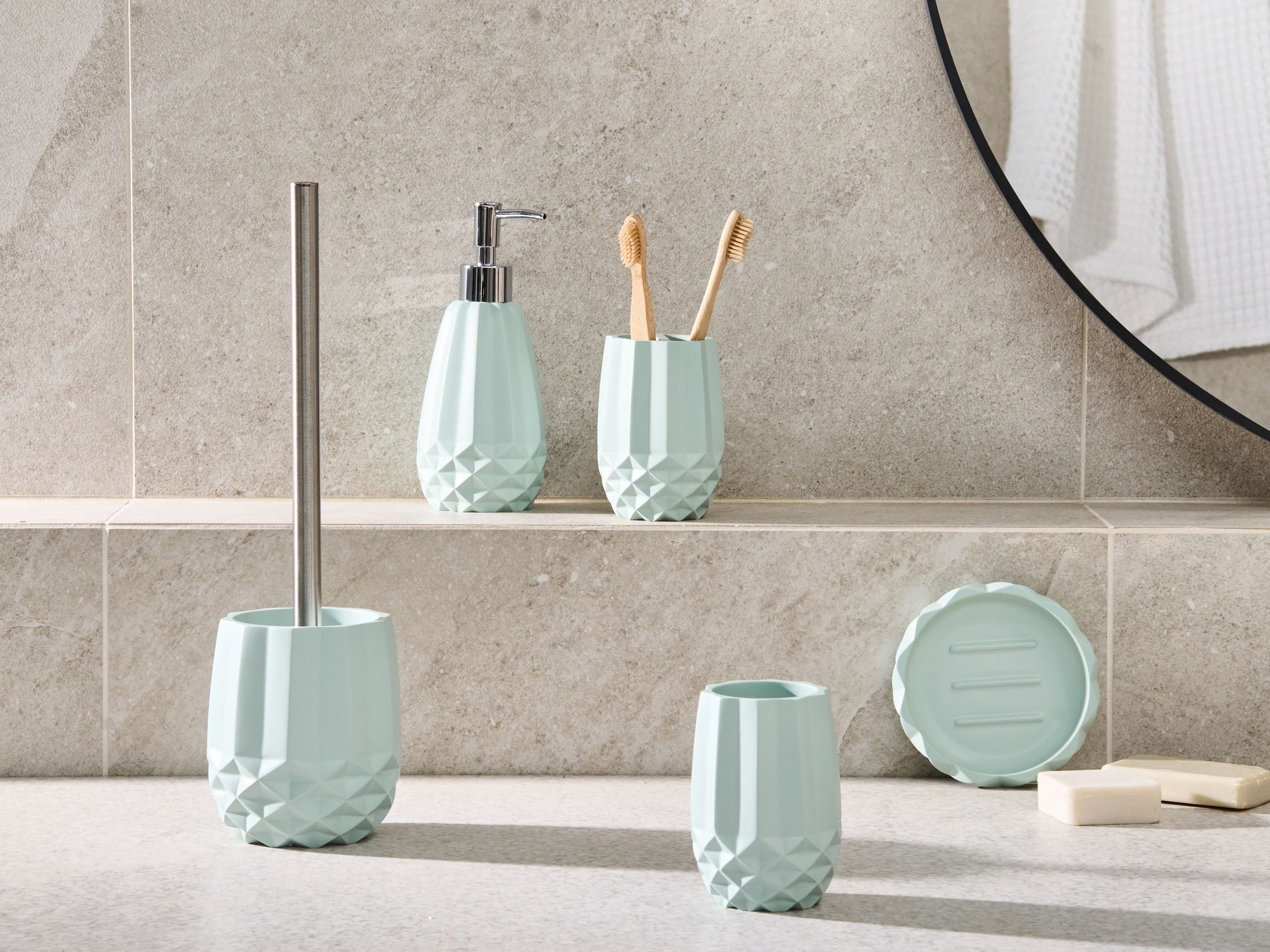 Geometrinen kylpyhuonesetti. Tämä käytännöllisiä tarvikkeita sisältävä kylpyhuonesetti on valmistettu polyhartsista ja suunniteltu pitämään kylpyhuone siistissä järjestyksessä. Siihen kuuluu saippuapidike, nestepumppu shampoolle, saippualle tai voiteille, hammasharjapidike, monikäyttöinen vesilasi ja vessaharja. Viehättävän sävyisissä tarvikkeissa on koristeellinen geometrinen kuviointi. Setti on välttämätön valinta, joka kuuluu osaksi jokaista kylpyhuonetta.