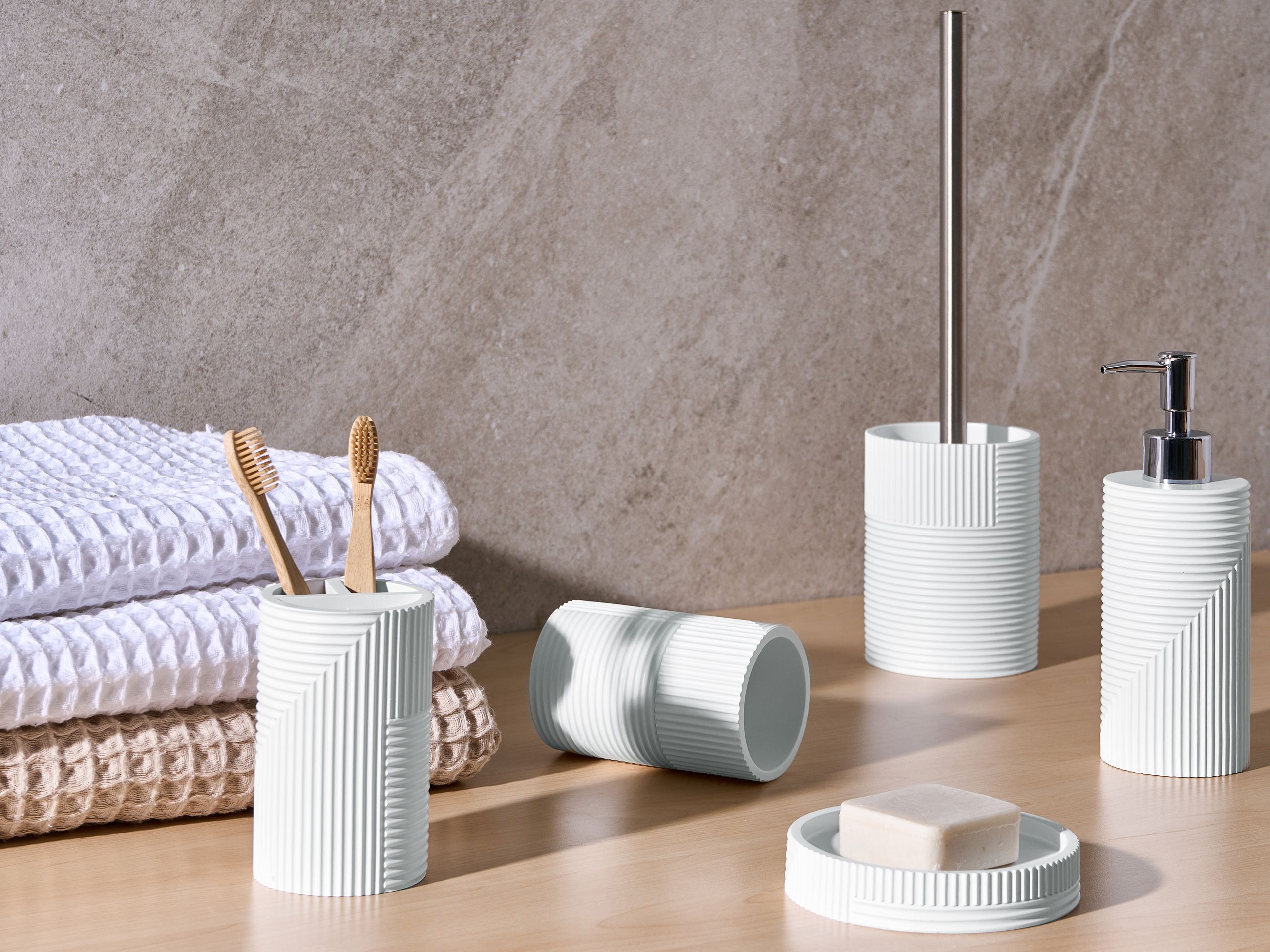 Modernit kylpyhuoneen tarvikkeet. Tämä moderni kylpyhuonesetti on erinomainen lisä mihin tahansa kylpyhuoneeseen. Saippuapidikkeen, saippua-annostelijan, vessaharjan, hammasharjapidikkeen ja vesilasin sisältävä setti on valmistettu polyhartsista, ja se auttaa pitämään tilan yhtenäisenä ja järjestyksessä. Tyylikäs, geometrinen uurrettu pinta tuo nykyaikaista ilmettä ja täydentää moderneja sisustuksia.