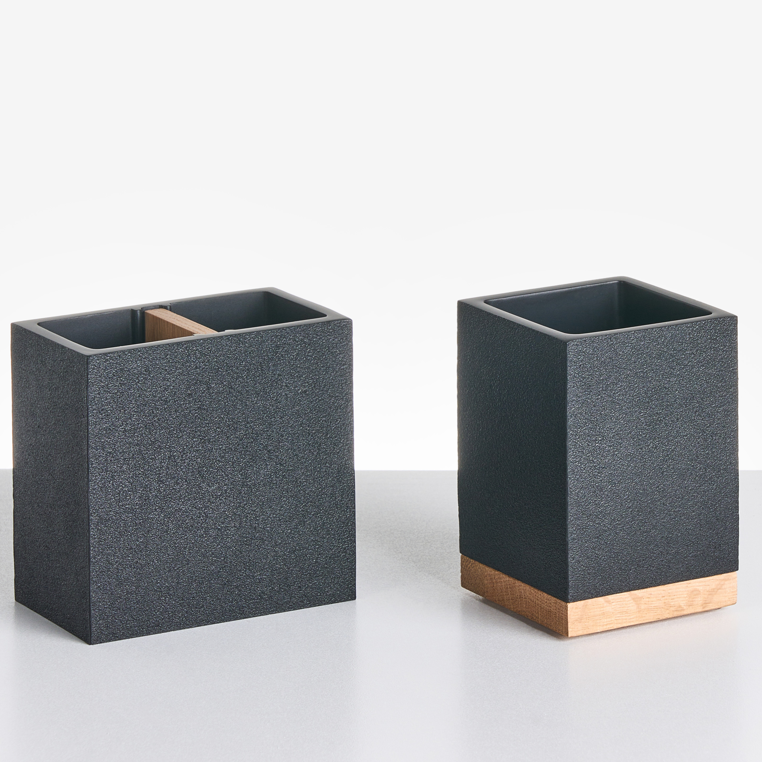 Minimalistinen kylpyhuonesetti puuaksenteilla. Tämä kylpyhuonesetti tarjoaa erinomaisen tavan järjestää kosmetiikka ja muut tärkeät tarvikkeet, mikä auttaa pitämään kylpyhuoneen siistinä ja viimeisteltynä. Setti sisältää vessaharjan, hammasharjapidikkeen, saippuapidikkeen, vesilasin ja saippua-annostelijan – kaiken, mitä tarvitset jokapäiväiseen käyttöön. Kestävästä polyhartsista valmistettuja tarvikkeita täydentävät tammipohjat, jotka tuovat lämmintä ja luonnollista ilmettä. Moderni mutta minimalistinen muotoilu sulautuu saumattomasti monenlaisiin sisustuksiin, mikä tekee setistä tyylikkään ja toimivan valinnan.
