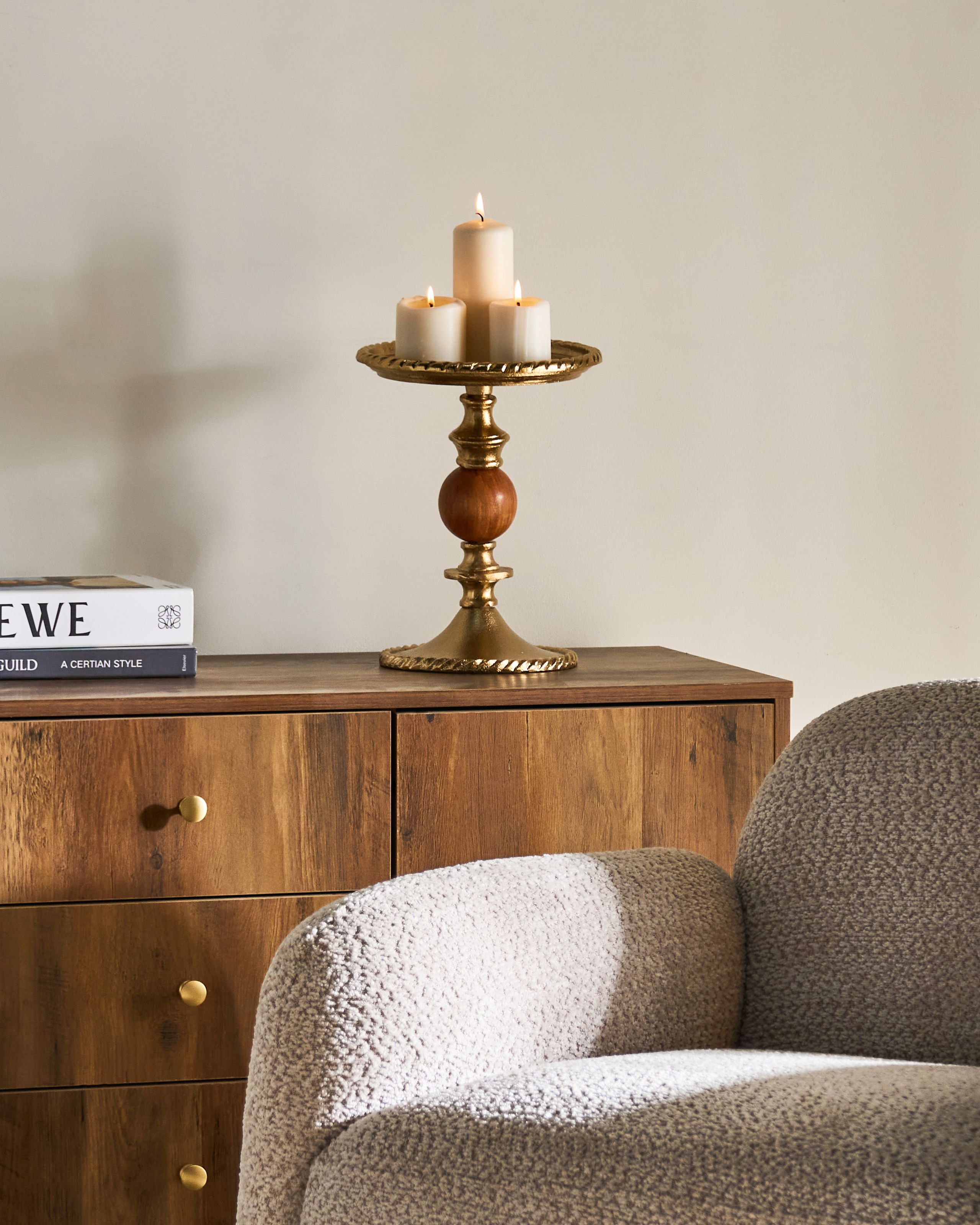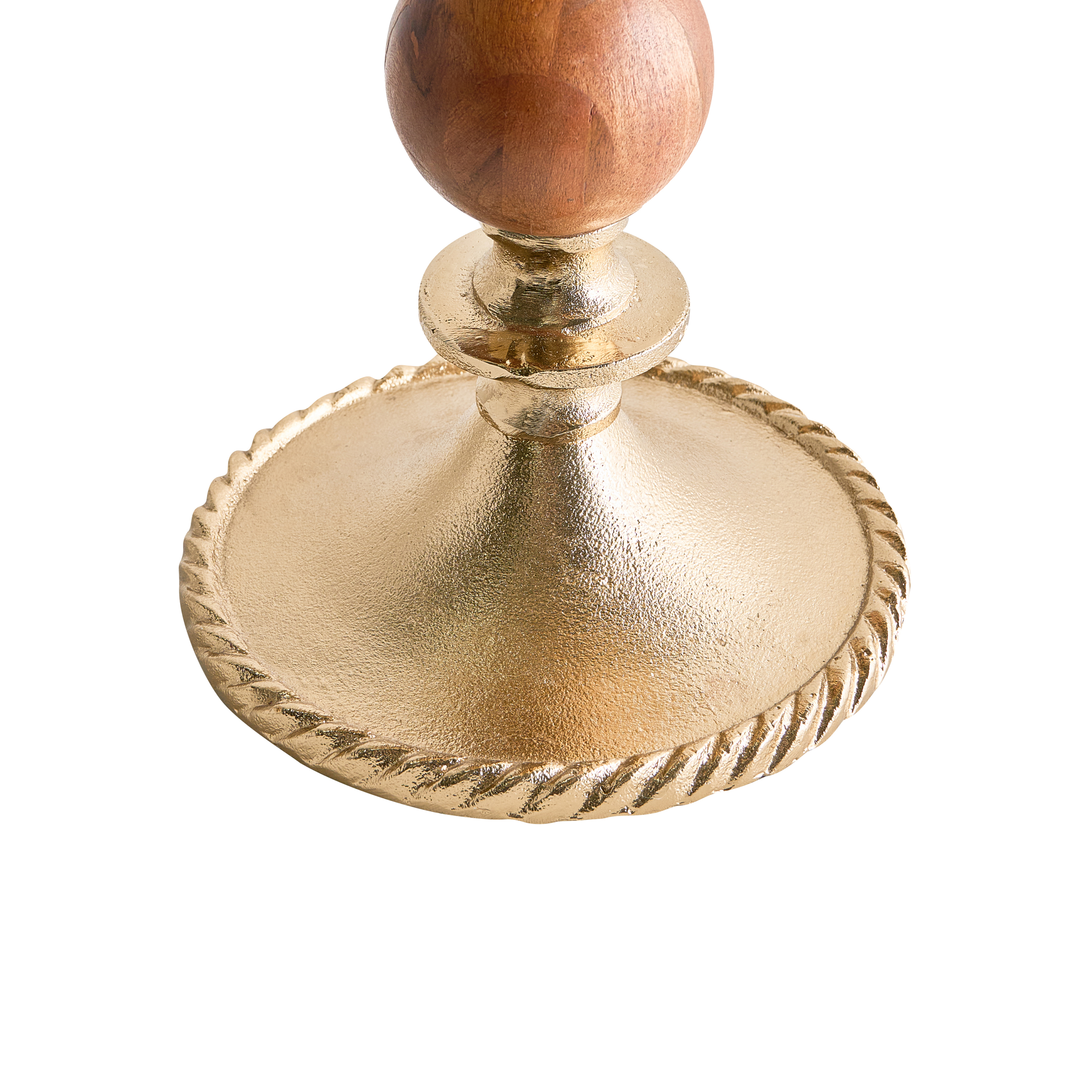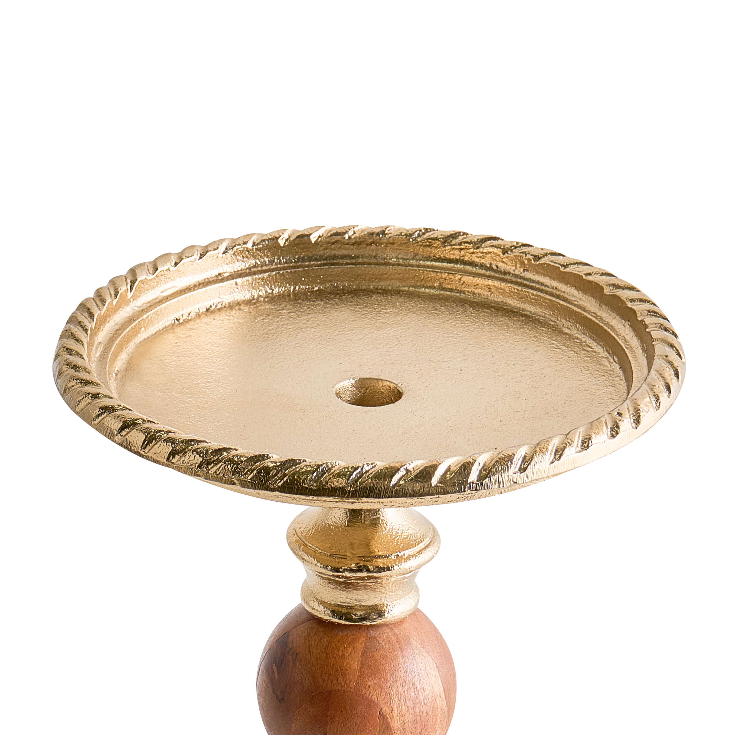 Käsintehty jalallinen kynttilätarjotin. Tämä elegantti kynttilänjalka on käsin valmistettu alumiinista ja sen jalkaa koristaa sievä akaasiapuinen aksentti. Kullanvärinen viimeistely ja hienovaraisesti kaiverretut reunat tuovat ripauksen klassista hienostuneisuutta, kun taas luonnonpuu lisää tasapainoa ja lämpöä. Kynttilänjalka on suunniteltu useille kynttilöille, mikä tekee siitä erinomaisen näyttävän yksityiskohdan ruokapöydälle, konsolipöydälle tai takanreunukselle.