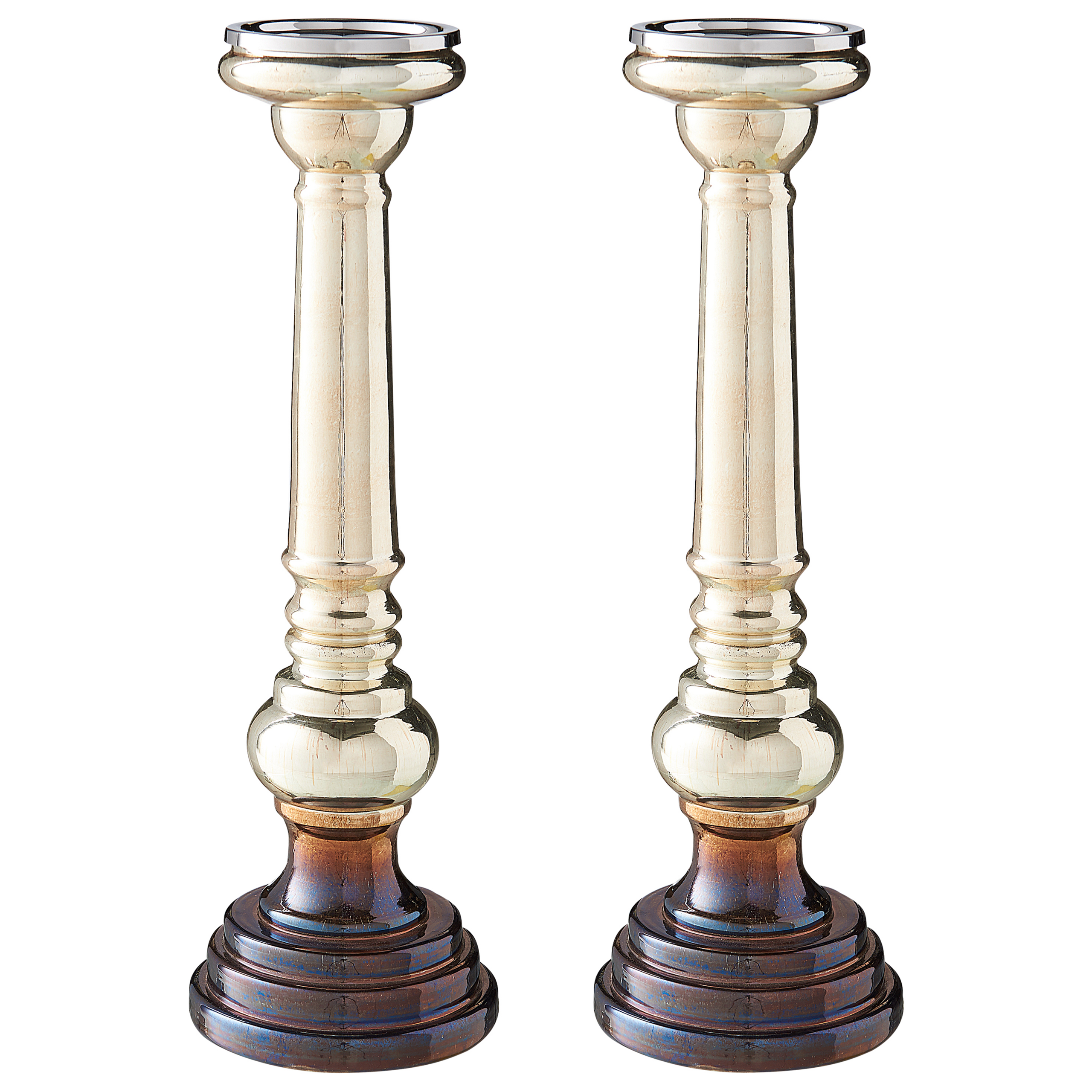 Elegantti kahden kynttilänjalan setti. Päivitä sisustuksen ilmettä näillä tyylikkäillä, viktoriaanisen muotoilun inspiroimilla kynttilänjaloilla. Paksusta lasista valmistetut kynttilänjalat erottuvat mistä sisustuksesta muodollaan ja klassisen kullan sekä irisoivan värin yhdistelmällään. Aseta kynttilänjalat ruokailutilan pöydälle tai olohuoneen senkille tuodaksesi tilaan tunnelmaa.