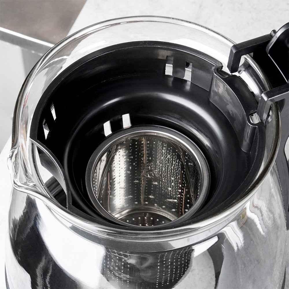 Ruostumattomasta teräksestä valmistettu haudutin - Hauduttimessa on tarkasti sijoitetut, hienot reiät, jotka erottavat teelehdet tehokkaasti haudukkeesta ja varmistavat kirkkaan juoman. Haudutin on helposti irrotettava, mikä mahdollistaa lehtien helpon puhdistuksen ja vaihdon, ja sen muotoilu mahdollistaa sekä hienojen irtolehtiteen että suurempien irtolehtisekoitusten käytön.