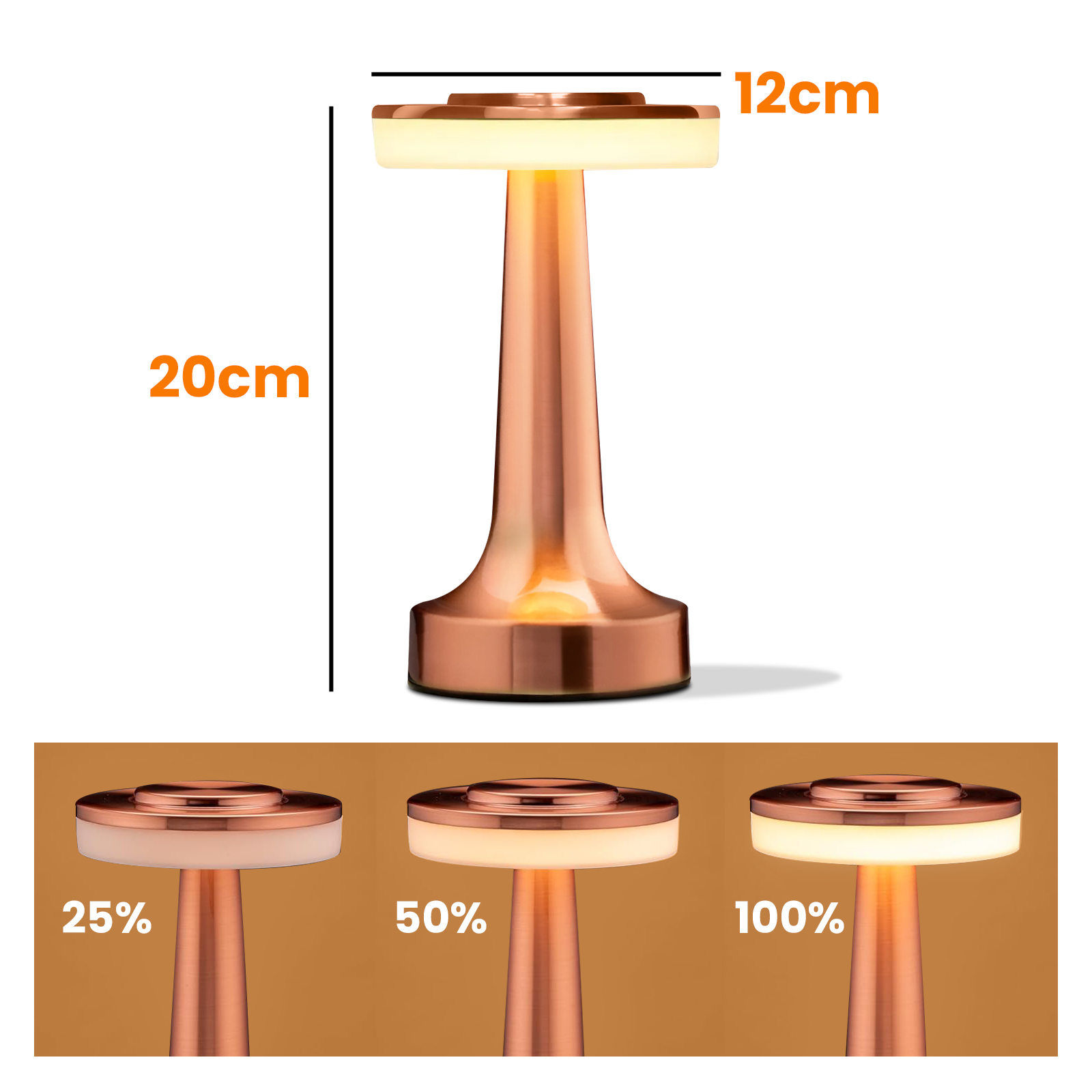 Tässä MaxExcellin kultaisen vaaleanpunaisessa langattomassa LED-pöytävalaisimessa yhdistyvät nykyaikainen muotoilu ja säädettävä valaistus, jotka parantavat kotiasi. Sen yläosaan kiinnitetyn kosketussäätimen avulla on helppo valita haluamasi valaistustunnelma ja säätää valaistusvoimakkuutta 25 %:sta 100 %:iin. Se levittää pehmeää, vakaata valoa, joka on silmiä miellyttävä. Se on ladattavissa USB-C-liitännän kautta ja tarjoaa jopa 8 tunnin autonomian.