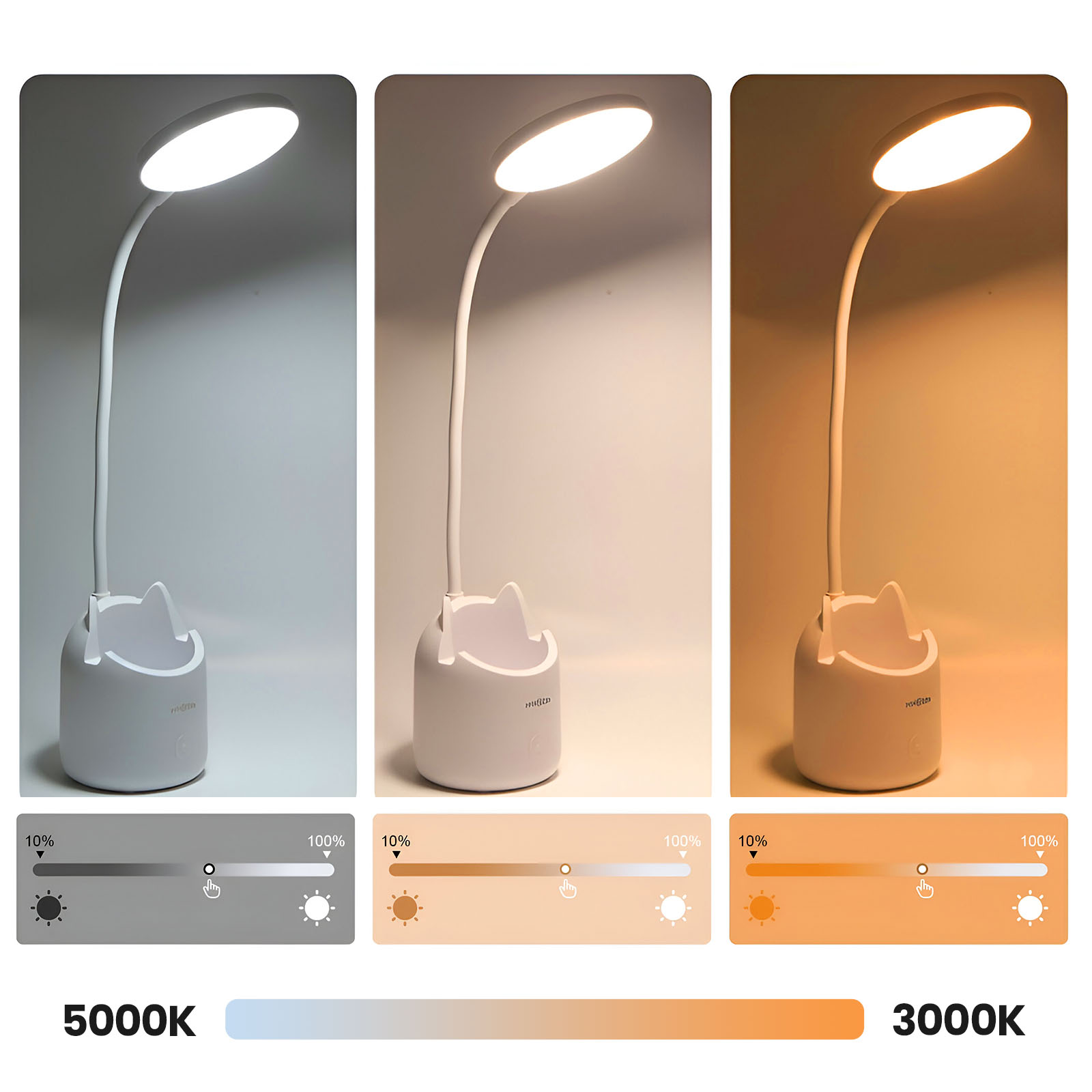 Tämä johdoton LED-valaisin tarjoaa pehmeää, säädettävää valaistusta kolmella valaistustunnelmalla, jotka sopivat erinomaisesti työhön, lukemiseen tai opiskeluun. Sen joustavan varren avulla voit suunnata valon tarkasti. Kompaktissa ja käytännöllisessä valaisimessa on kynäteline ja älypuhelinpidike. Sen ladattava akku tarjoaa jopa 13 tunnin käyttöajan, joten sitä voi käyttää mukavasti missä tahansa.