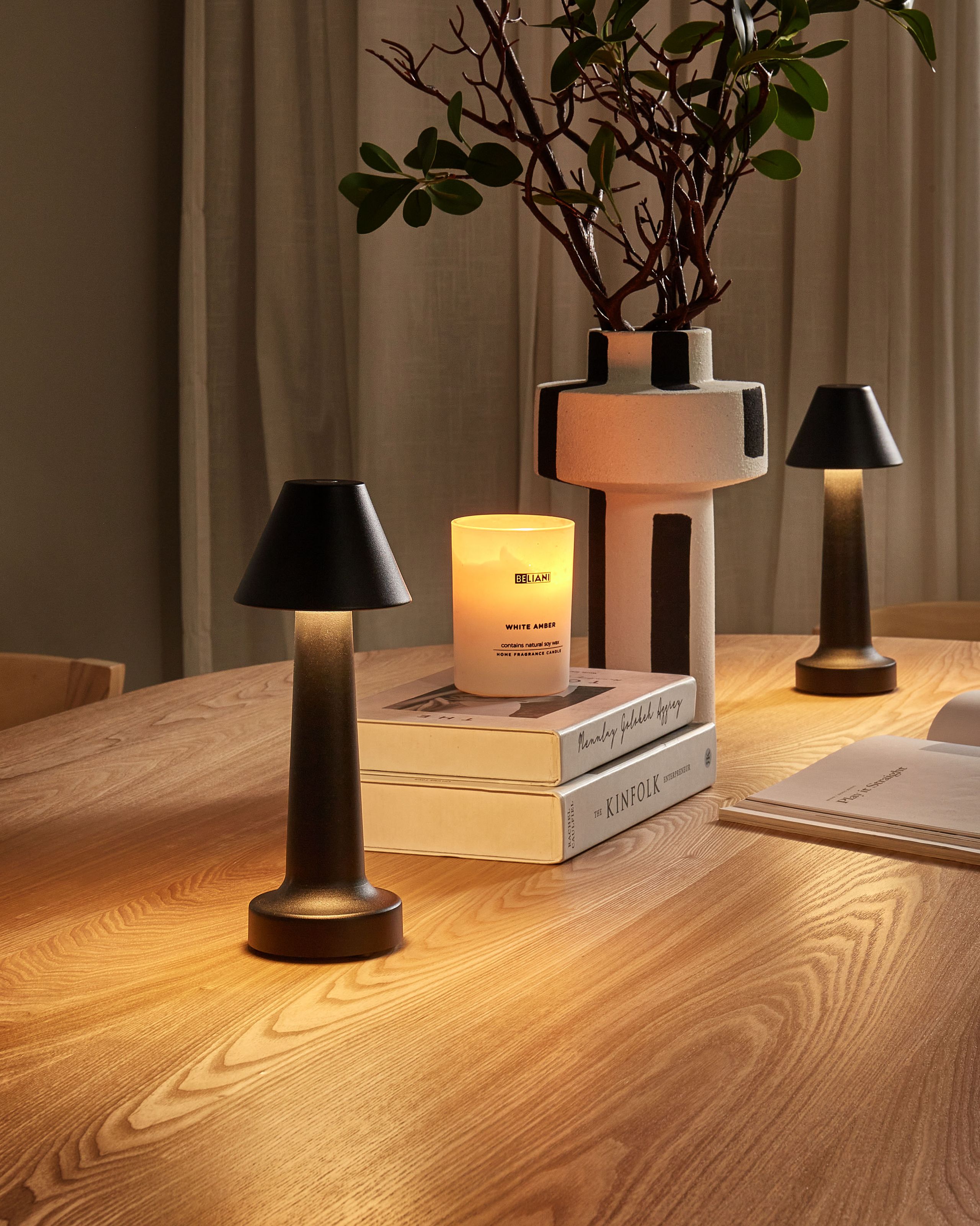 Elegantti langaton pöytävalaisinsetti. Lisää ripaus glamouria sisä- tai ulkotilaan tällä tyylikkäällä kahden mustan pöytävalaisimen setillä. Valaisimien moderni muotoilu ja LED-valojen loistelias hehku tekevät niistä näyttävät esineet, jotka lisäävät lämpöä ja hienostuneisuutta jokaiseen ympäristöön. Ne sopivat erinomaisesti viihtyisän ja kutsuvan tunnelman luomiseen niin terassille kuin olohuoneeseenkin. Langaton, ladattava ominaisuus ja kosketuskytkimellä säädettävä, kolmeen värilämpötilaan asetettava himmennystoiminto tekevät siitä toiminnallisen valinnan joka kotiin.