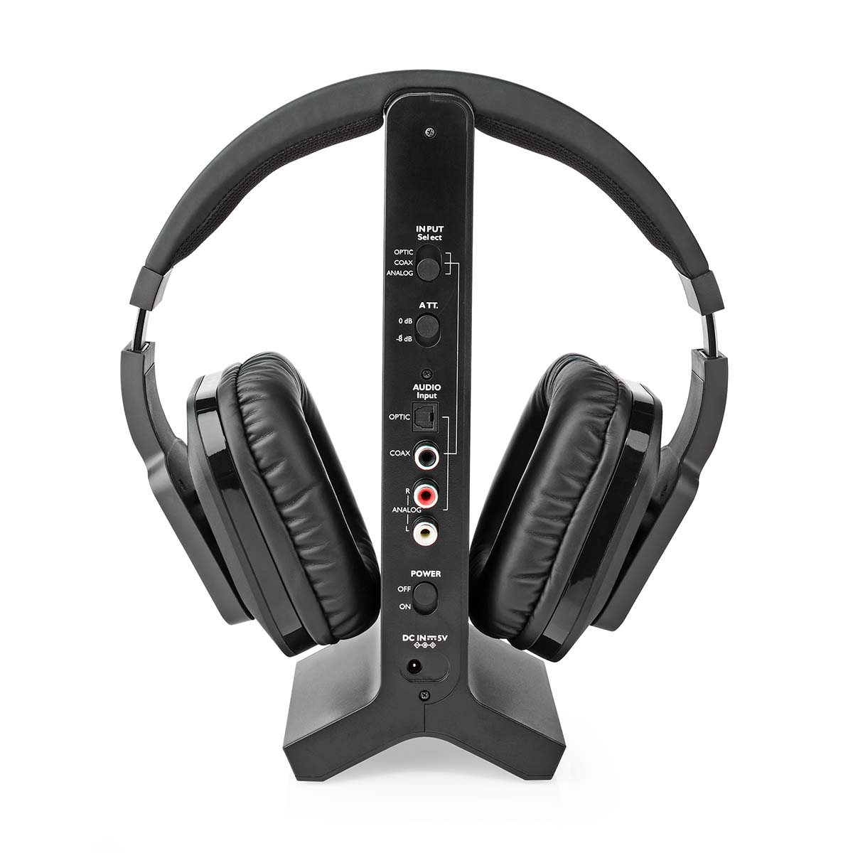 Langattomat RF-televisiokuulokkeet korvan ympärillä, latausasemalla ja 25 metrin kantamalla