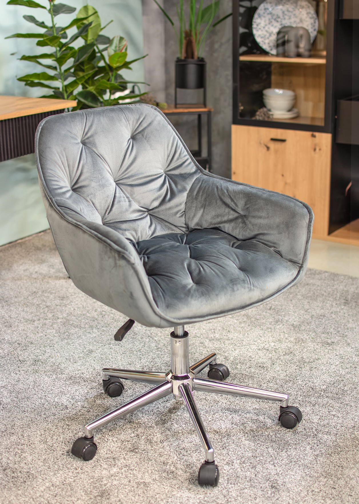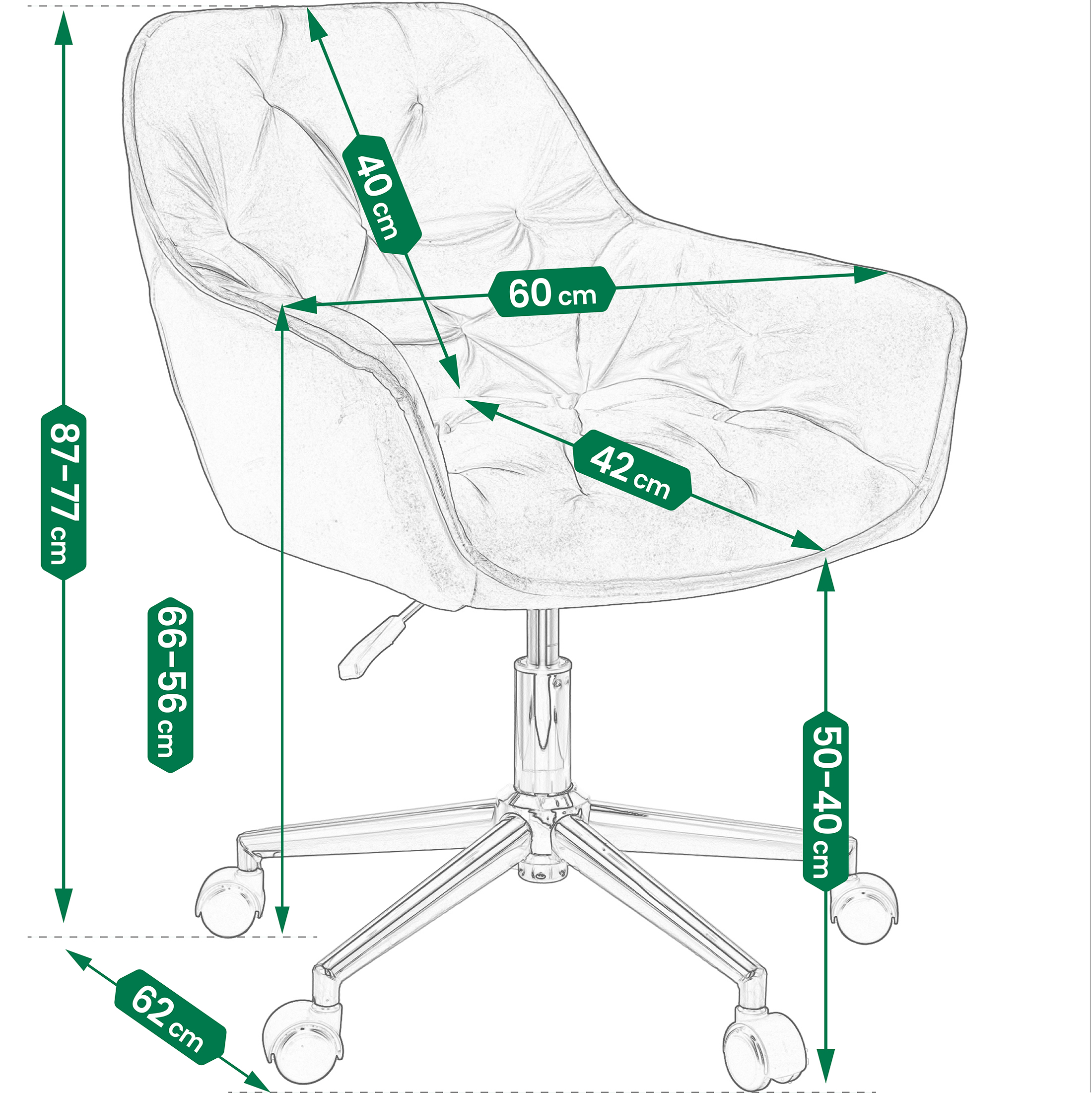 Elegantti toimistonojatuoli, verhoiltu pehmeällä sametilla, yhdistäen modernin muotoilun poikkeukselliseen mukavuuteen. Korkeudensäätö ja 360 asteen kääntö varmistavat mukavuuden työskentelyn aikana. Tukeva jalusta viidellä pyörällä takaa vakauden ja liikkuvuuden. Ihanteellinen toimistoihin ja kotitoimistoihin, lisää tyyliä ja luokkaa tilaan.