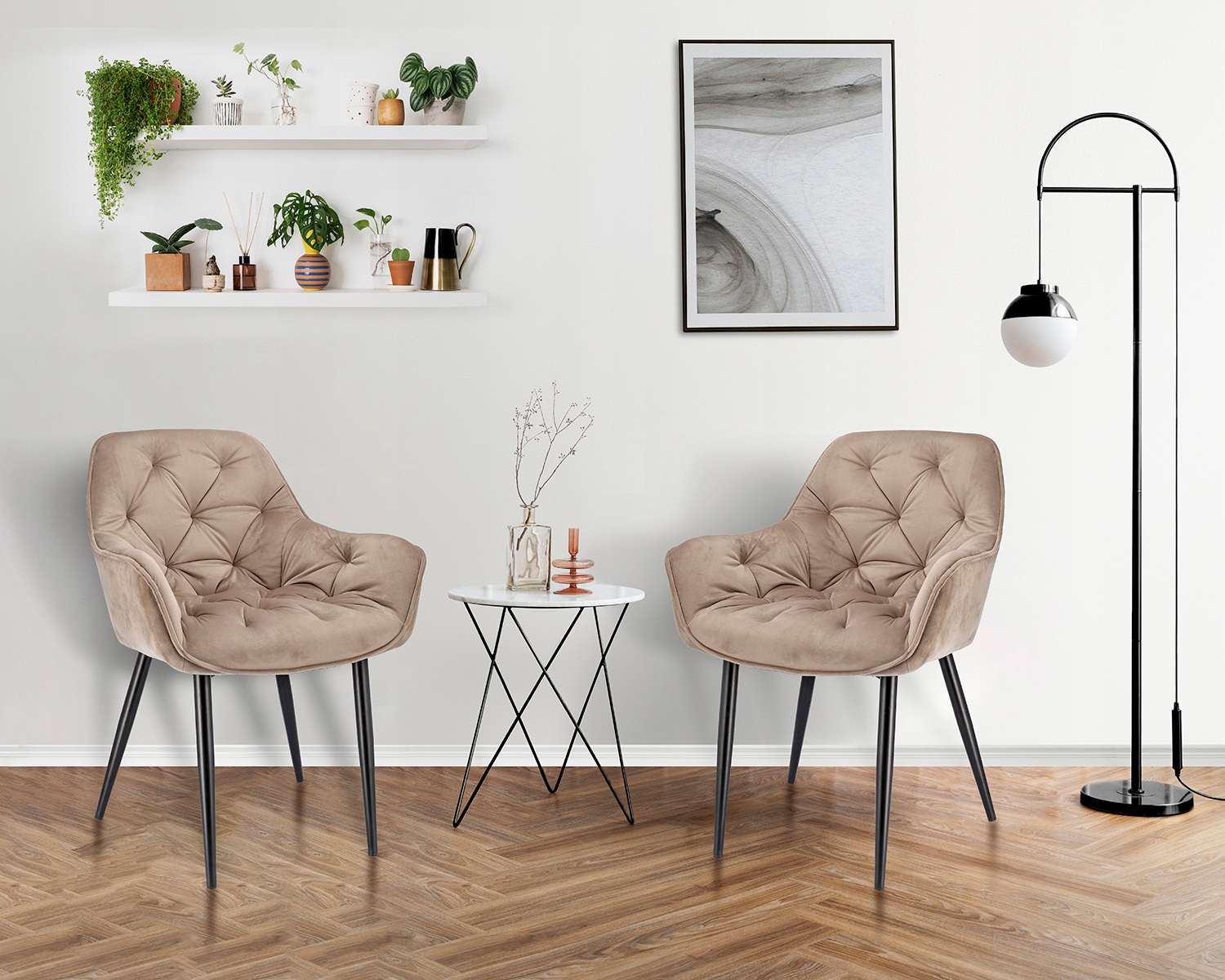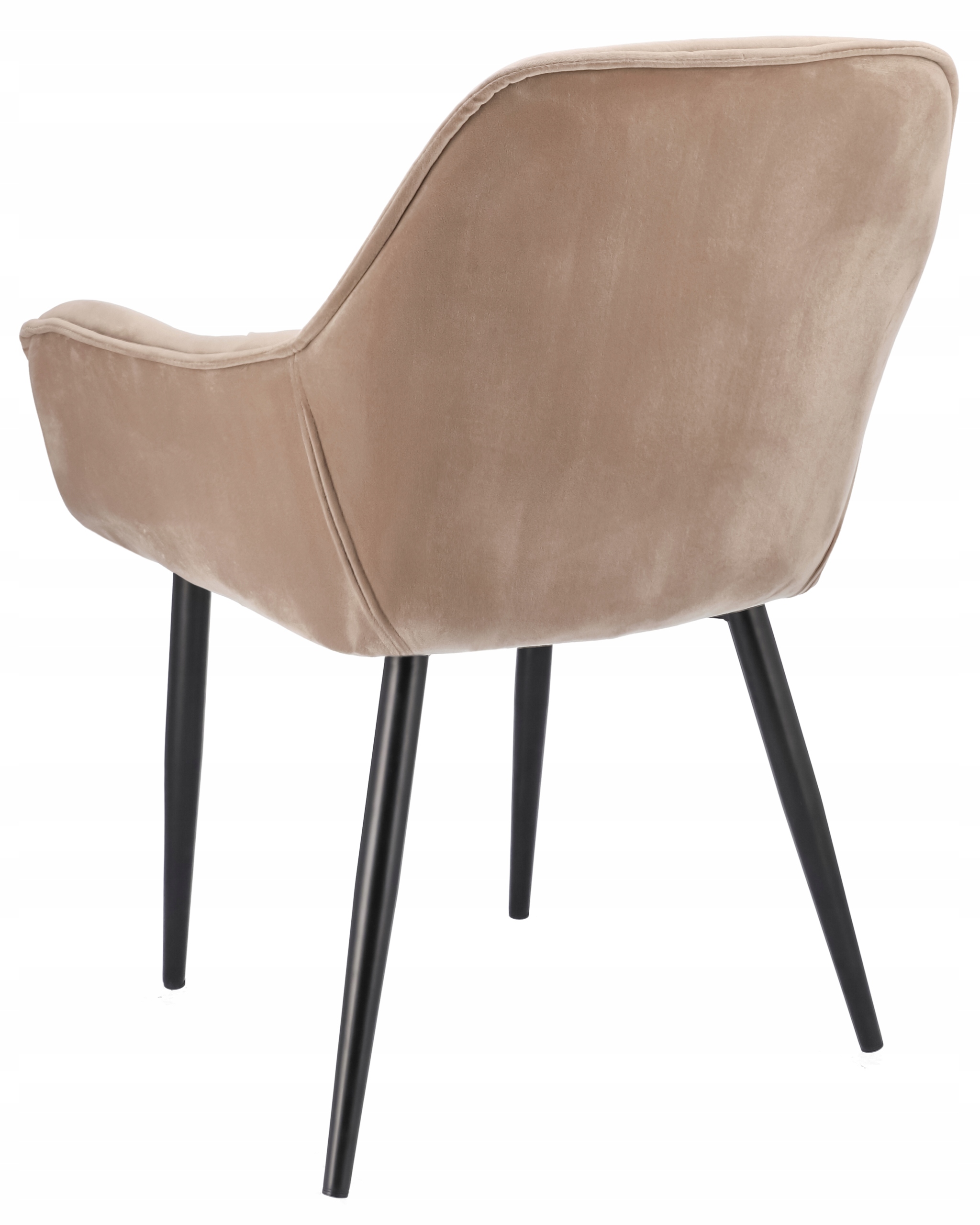Tukeva, samettinen tuoli on varustettu pehmeällä istuimella ja korkealla selkänojalla, jossa on koristeellinen tikkaus. Koko tuolin näyttää kevyeltä hoikkien mustien jalkojen ansiosta, jotka antavat visuaalista keveyttä ja samalla varmistavat täydellisen vakauden. Selkänojan ja käsinojien korkeus ja pehmeys tekevät tuolista uskomattoman mukavan.