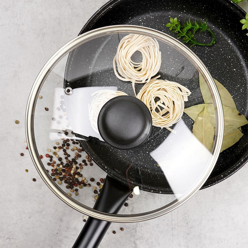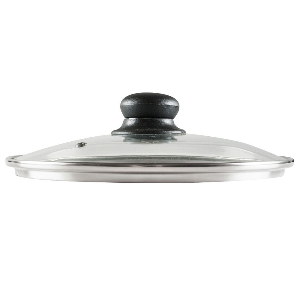 LASI - Kansi on valmistettu kuumuutta kestävästä, läpinäkyvästä lasista. Siinä on hopeinen ruostumattomasta teräksestä valmistettu reunus ja kestävä musta muovikahva. Läpinäkyvän kannen ansiosta voit tarkistaa kypsennysprosessin nostamatta sitä. Kansi kestää jopa +200 °C:n lämpötiloja.