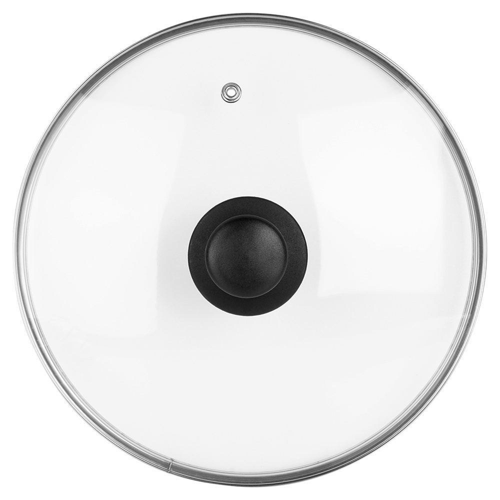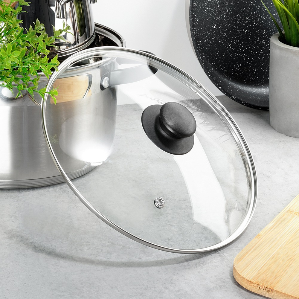 LASI - Kansi on valmistettu kuumuutta kestävästä, läpinäkyvästä lasista. Siinä on hopeinen ruostumattomasta teräksestä valmistettu reunus ja kestävä musta muovikahva. Läpinäkyvän kannen ansiosta voit tarkistaa kypsennysprosessin nostamatta sitä. Kansi kestää jopa +200 °C:n lämpötiloja.