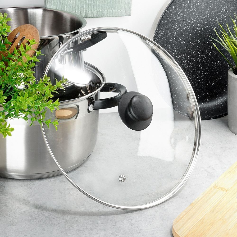 LASI - Kansi on valmistettu kuumuutta kestävästä, läpinäkyvästä lasista. Siinä on hopeinen ruostumattomasta teräksestä valmistettu reunus ja kestävä musta muovikahva. Läpinäkyvän kannen ansiosta voit tarkistaa kypsennysprosessin nostamatta sitä. Kansi kestää korkeita lämpötiloja jopa +200 °C:een asti.