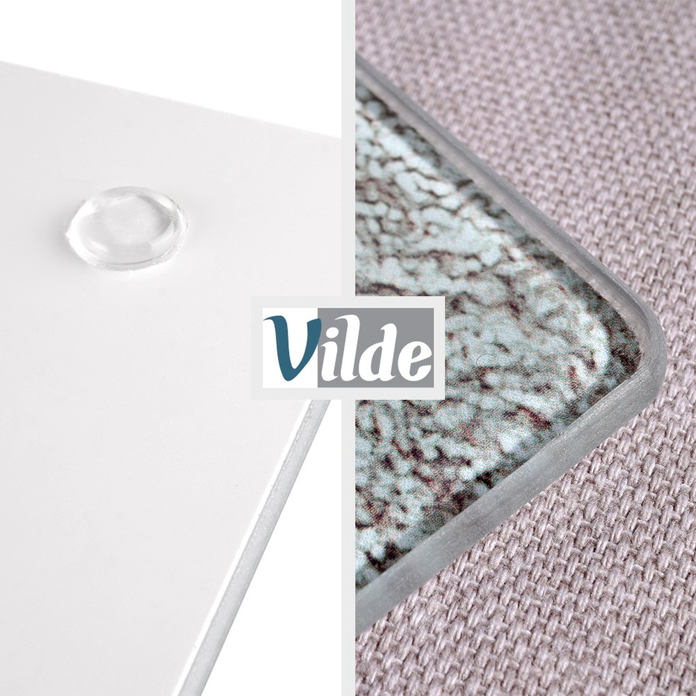 Kahden lasisen leikkuulaudan setti. Niillä on suorakaiteen muoto ja tyylikäs muotoilu. Laudat on helppo puhdistaa ja mukava käyttää liukumattomien jalkojensa ansiosta. Niissä on suuri leikkuupinta. Välttämätön jokaisessa keittiössä. Nämä laudat pitävät työtasosi puhtaana ja suojaavat sitä naarmuilta. Alkuperäinen Vilde-tuote. Valmistettu eurooppalaisten standardien mukaisesti.