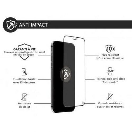 Tämä karkaistusta lasista valmistettu näytönsuoja on suunniteltu suojaamaan iPhone 12/12 Pro -puhelimesi näyttöä naarmuilta ja iskuilta. Se on 10 kertaa kestävämpi TechShock 360° -tekniikan ansiosta, joka neutraloi sivuttaiset iskut. Näytönsuojan reunat on vahvistettu rajoittamaan suoria iskuja näyttöön. Lasi tuntuu miellyttävältä koskettaa ja on täysin läpinäkyvä.