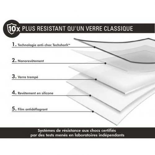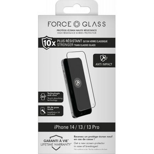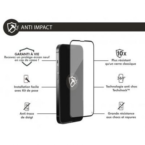 Tämä karkaistua lasia oleva näytönsuoja on suunniteltu suojaamaan iPhone 13/13 Pro/14 -puhelimen näyttöä naarmuilta ja iskuilta. Se on 10 kertaa kestävämpi TechShock 360° -teknologian ansiosta, joka neutralisoi sivutörmäykset. Näytönsuojan reunat on vahvistettu rajoittamaan näyttöön kohdistuvia suoria iskuja. Lasi on miellyttävän tuntuista ja täysin läpinäkyvää.
