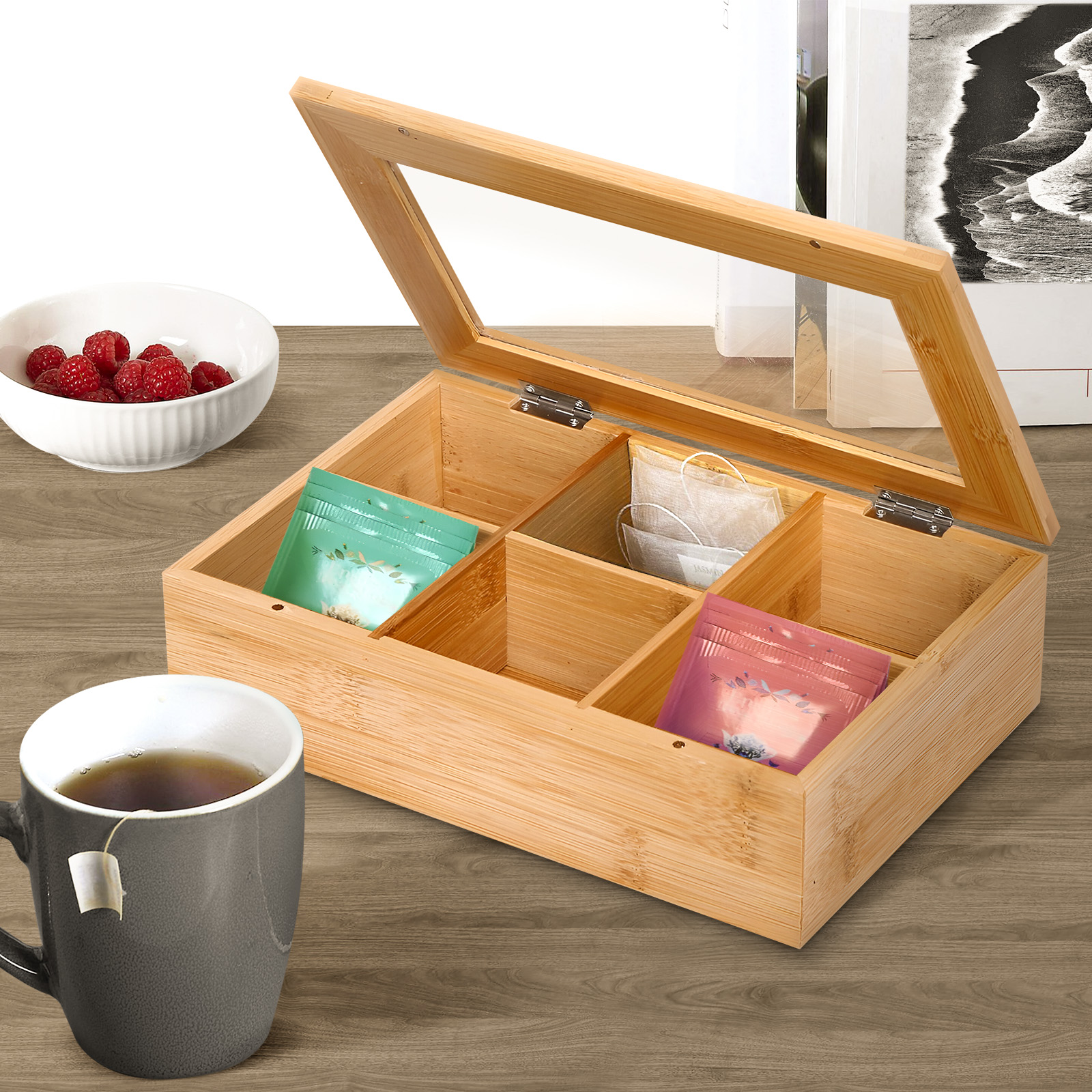 Järjestä teesi tyylikkäästi tässä Cheffinger-laatikossa. Sen 6 tilavaa lokeroa, lasitettu muotoilu ja hienostunut luonnollinen bambu yhdistävät toiminnallisuuden ja estetiikan. Tämä laatikko on ihanteellinen teepussien säilytykseen ja esillepanoon, ja se sopii hyvin mihin tahansa keittiöön, sillä se on tyylikäs, käytännöllinen ja ympäristöystävällinen säilytyslaatikko.