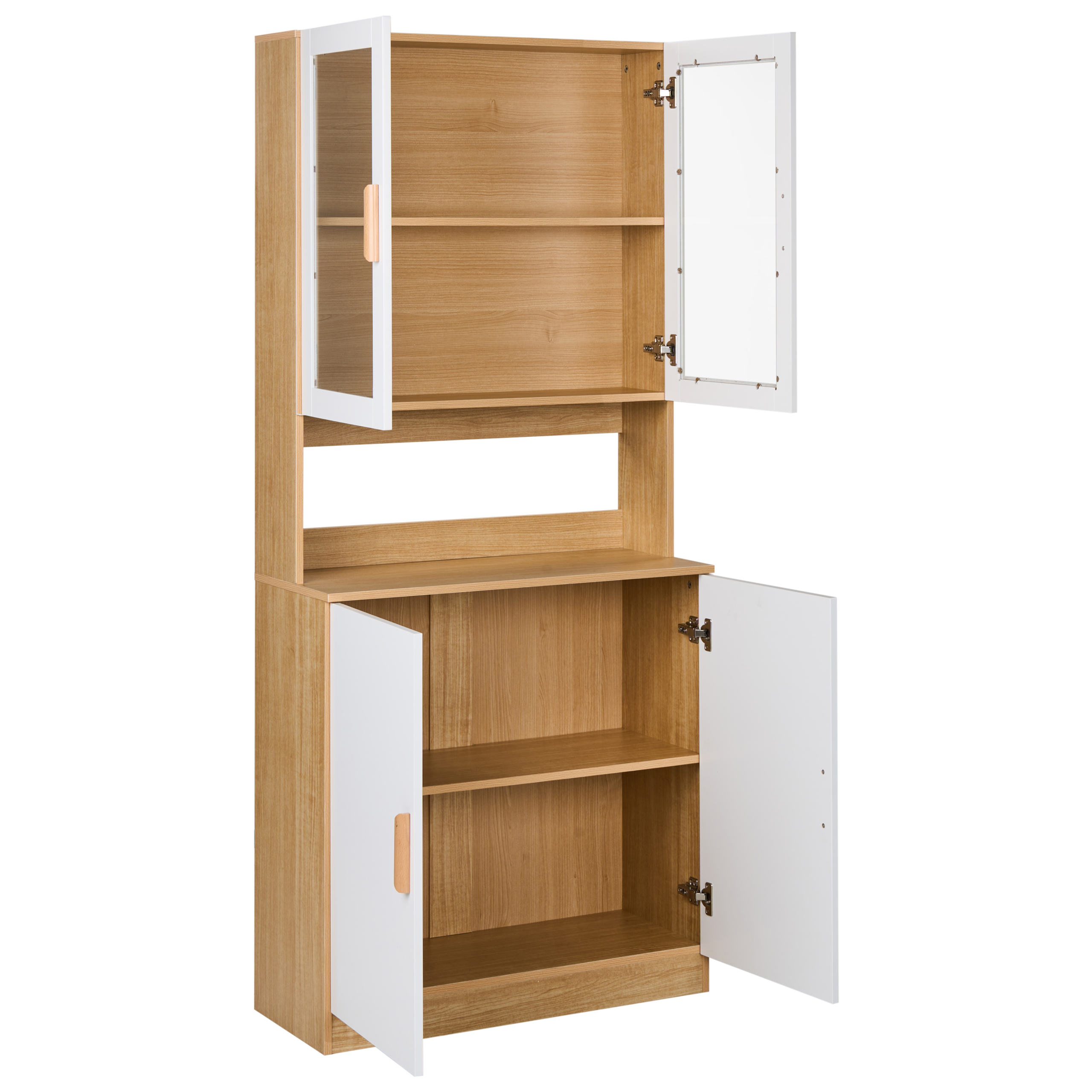 Tyylikäs astiakaappi lasiovilla. Tässä nykyaikaisessa astiakaapissa yhdistyvät vaaleanruskea puukuvio ja kirkkaanvalkoiset ovet, mikä luo raikkaan, skandinaavisen ilmeen. Kestävästä MDF-levystä valmistettu kaappi, jonka yläovet on varustettu lasipaneeleilla, tarjoaa sekä piilotettua että avointa säilytystilaa astiastoille, kuivatuotteille, säilykkeille ja keittiötarvikkeille. Kompakti, pystysuora muotoilu sopii täydellisesti rajallisen tilan hyödyntämiseen ja kaiken järjestyksessä pitämiseen.