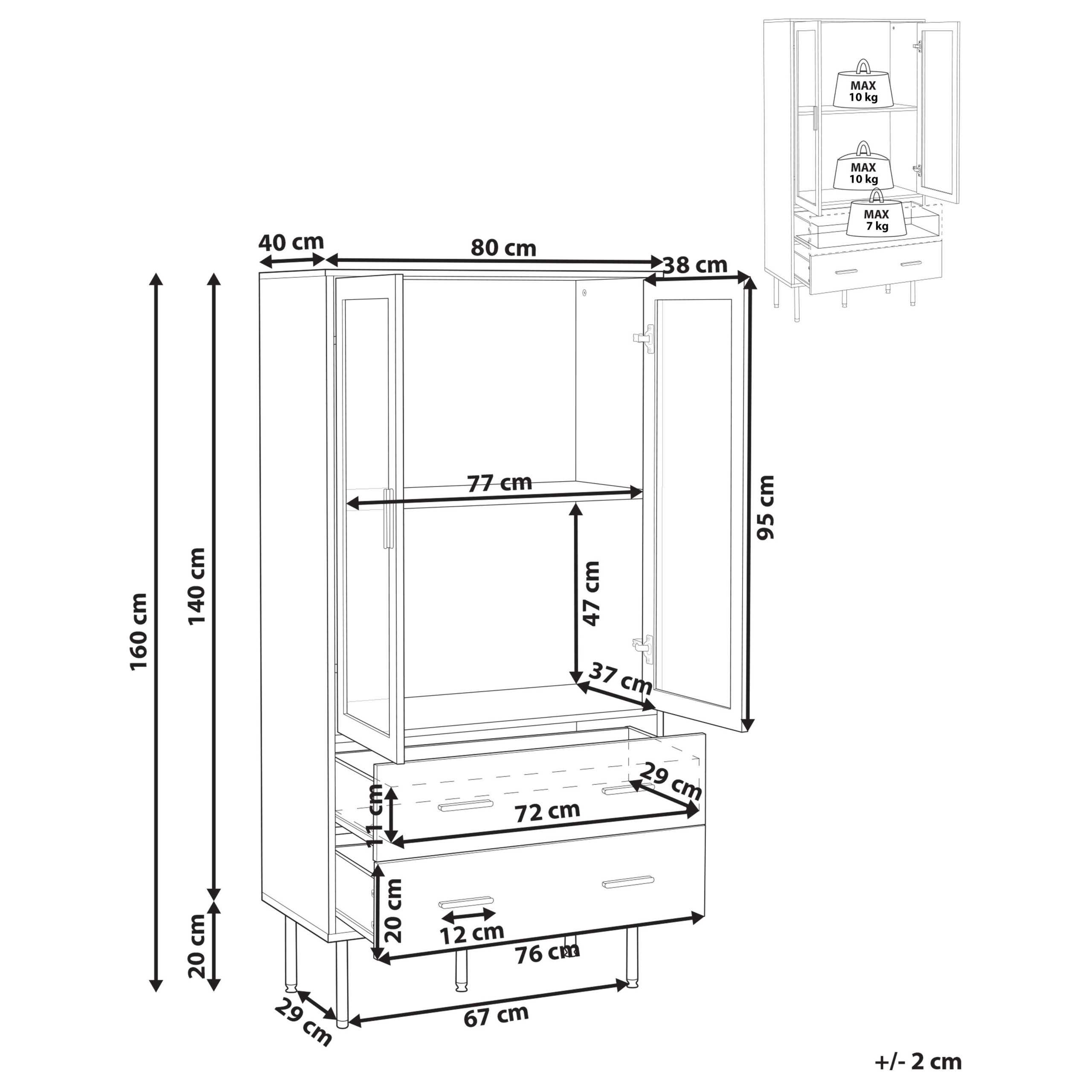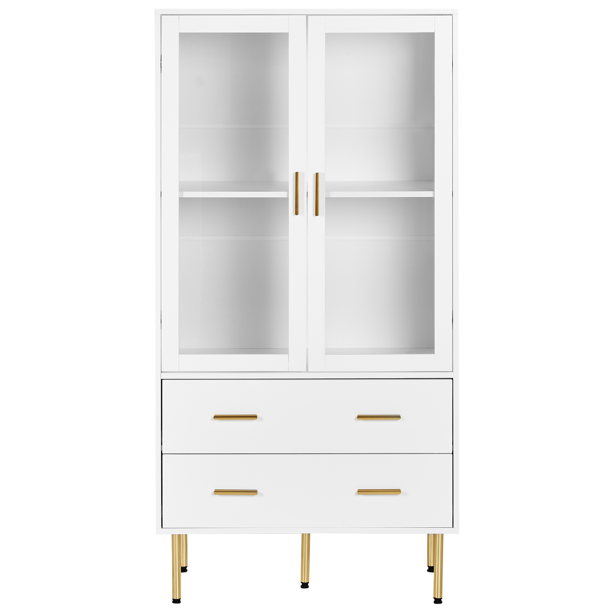 Glamour-tyylinen vitriini lasiovilla ja laatikoilla. Luo järjestelmällisempi ja tyylikkäämpi tila tällä elegantilla vitriinikaapilla, joka on suunniteltu kohottamaan mitä tahansa ruokailutilaa tai olohuonetta. Tyylikäs valkoinen runko täydentyy kauniisti kultaisilla metallijalolla ja yhteensopivilla nupeilla, jotka lisäävät ripauksen hienostuneisuutta. Kaapissa on kaksi tilavaa vetolaatikkoa ja kaksi lasiovien taakse kätkeytyvää hyllyä, joten se sopii täydellisesti niin astiastojen, kirjojen kuin koristeiden esittelyyn. Tämä vitriinikaappi on monipuolinen ja hienostunut valinta kaikille, jotka arvostavat sekä muotoa että toimivuutta.