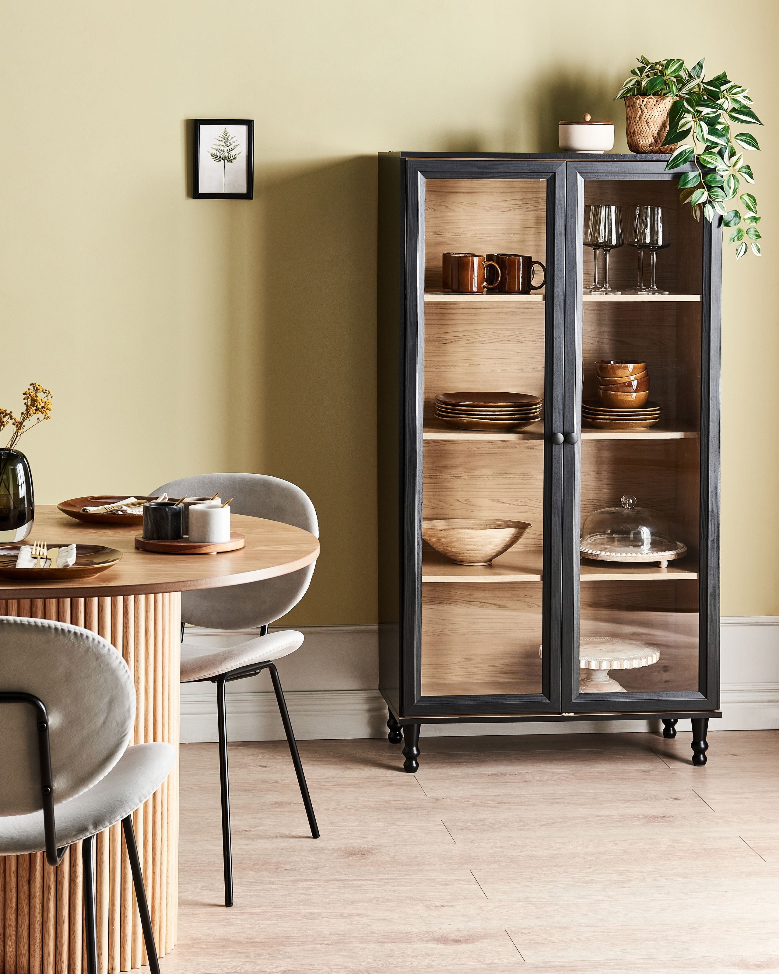 Skandinaavinen vitriini neljällä hyllyllä. Tämä ajaton vitriinikaappi yhdistää saumattomasti eleganssin ja käytännöllisyyden, lisäten kauneutta ja toiminnallisuutta jokaiseen ruokailutilaan, keittiöön tai olohuoneeseen. Kestävistä materiaaleista valmistetussa vitriinissä on kaksi lasiovea, vaalean puun sävyinen sisäpinta sekä massiivipuujalat, jotka tarjoavat vakautta. Neljä tilavaa hyllyä tarjoavat erinomaisesti tilaa suosikkiesineiden, koristeiden ja arvokkaiden kokoelmien esittelyyn. Se täydentää vaivattomasti sekä moderneja että perinteisiä sisustustyylejä.