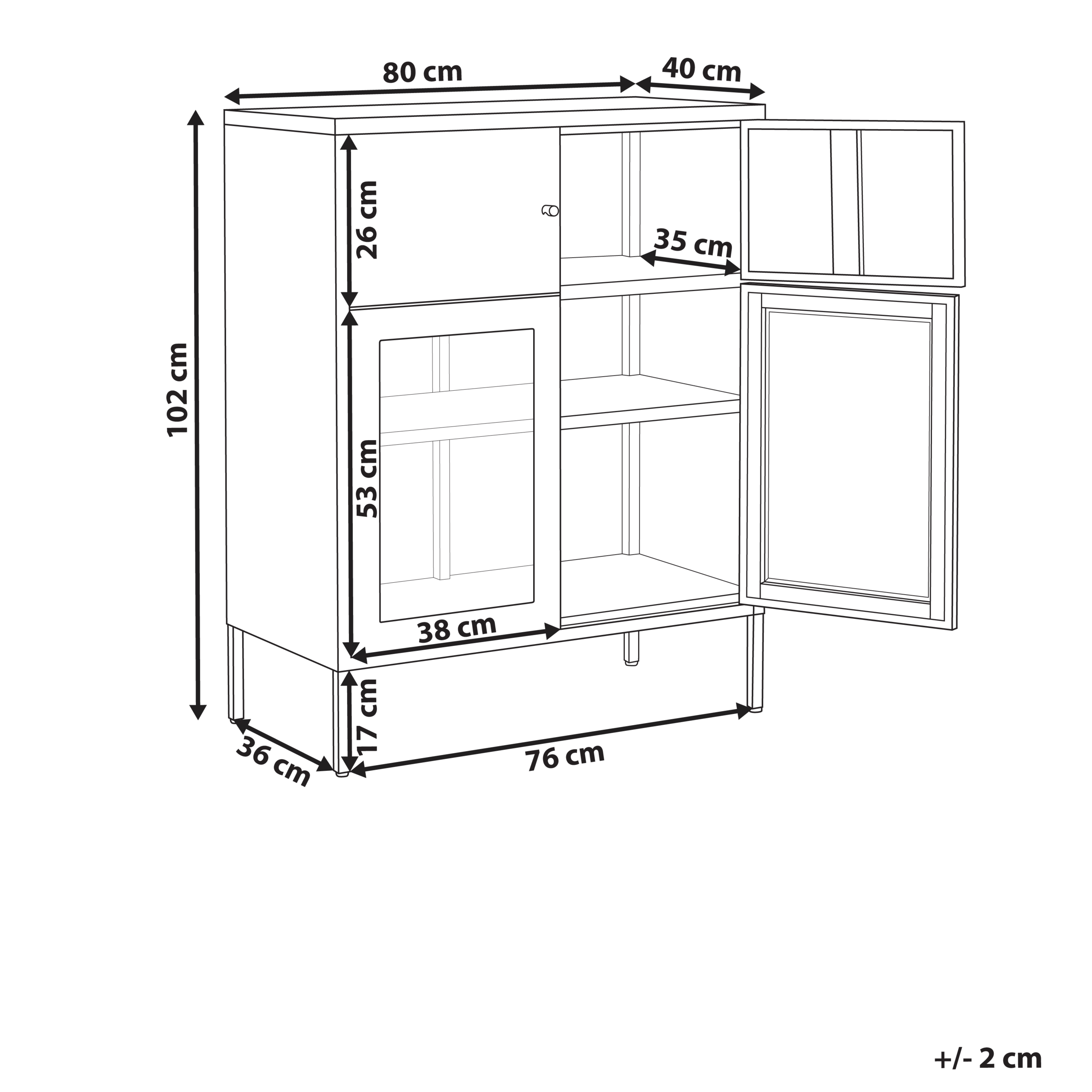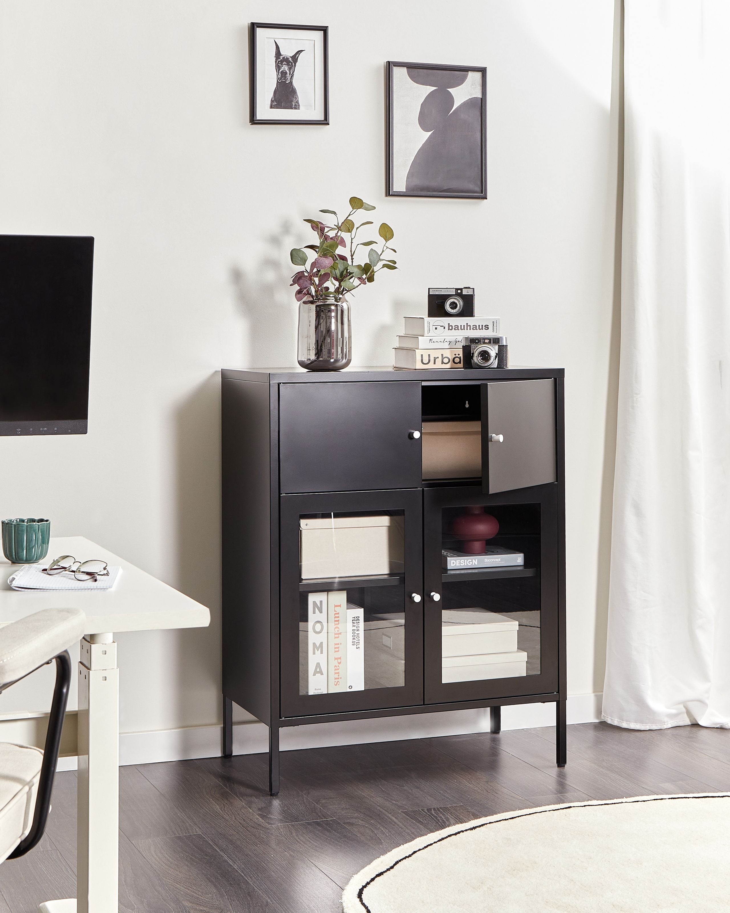 Skandinaavinen senkki lasiovilla. Tässä monipuolisessa rautakaapissa on selkeä ja nykyaikainen muotoilu, joten se sopii täydellisesti moderniin kotiin. Sen kaksi yläovea piilottavat kätevästi epäjärjestyksen, kun taas alaosan lasiovet tarjoavat ihanteellisen tilan kirjojen tai koriste-esineiden esittelyyn. Sirot rautajalat antavat kaapille kevyen ilmeen, mikä tekee siitä loistavan lisän mihin tahansa moderniin olohuoneeseen tai toimistoon.